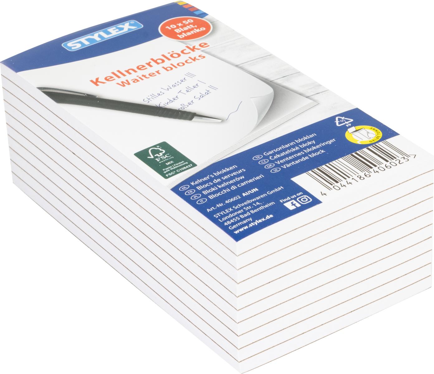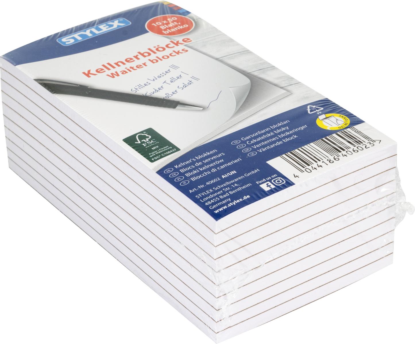 - Die kompakten kleinen Blöcke im Format von 7.5 x 14 cm bieten viel Platz für schnelle Notizen und Aufzeichnungen aller Art. Die jeweils 50 Blätter eines Blockes sind durch eine Kopfleimung verbunden und lassen sich leicht und rückstandslos abtrennen. Die weißen Seiten sind blanko, ohne Lineatur, gestaltet. Es ist keine Lochung und kein Rand vorgegeben. Egal ob Schreiben, Notieren oder Skizzieren, die praktischen Kellnerblöcke bieten viele Möglichkeiten zur Verwendung in Büro, Schule, Uni oder Haushalt. Nicht nur Bestellungen, auch Einkaufserinnerungen oder Notizen können schnell aufgenommen werden. Mit dem schmalen Format liegt der Block beim Schreiben gut in der Hand und kann weiterhin problemlos in jeder Tasche verstaut werden. Das Set umfasst 10 Kellnerblöcke.