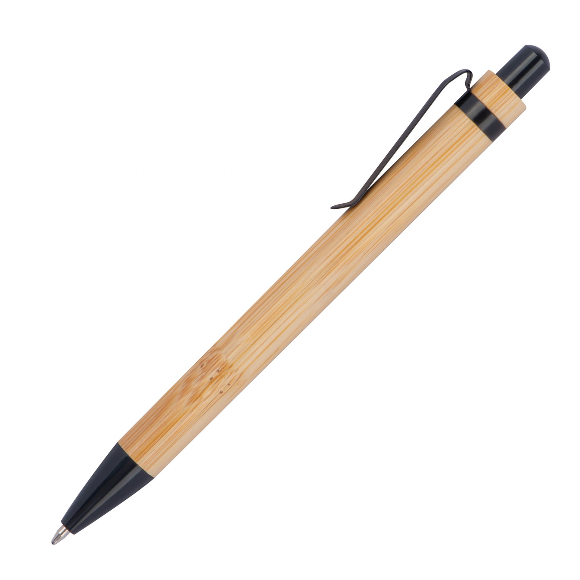 - der Kugelschreiber aus Bambus mit schwarzen Applikationen ist mit einer blauschreibenden Kunststoffgroßraummine ausgestattet