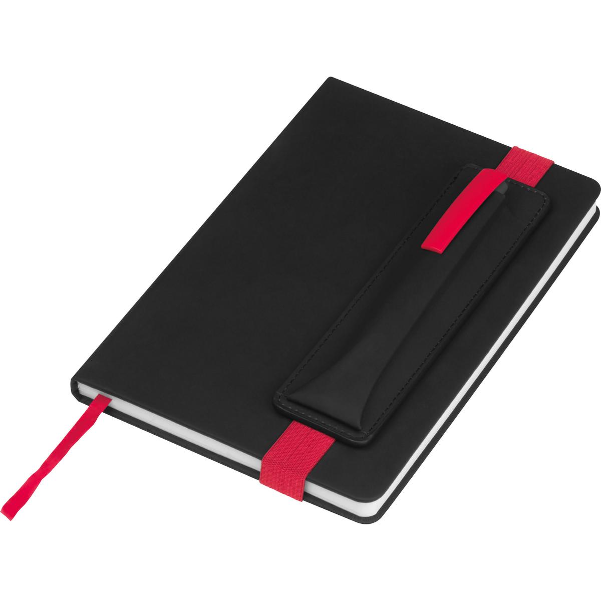 - mit Lesezeichen, Gummiband zum Verschließen, sowie einer am Gummiband befestigter Halterung für Kugelschreiber