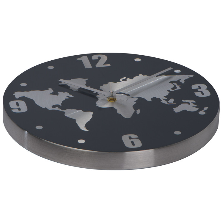 Wanduhr mit Namensgravur - aus Aluminium mit Weltkarte im Hintergrund