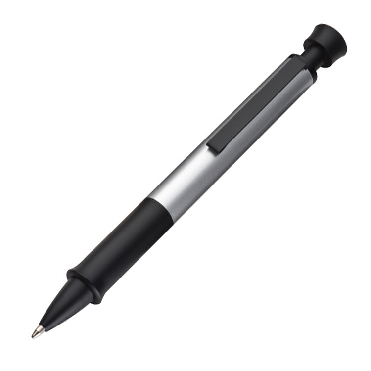 - Moderner Druckkugelschreiber aus Aluminium mit blau schreibender Metallgroßraummine, großem schwarzen Drücker und angenehmer Kunststoffgriffzone