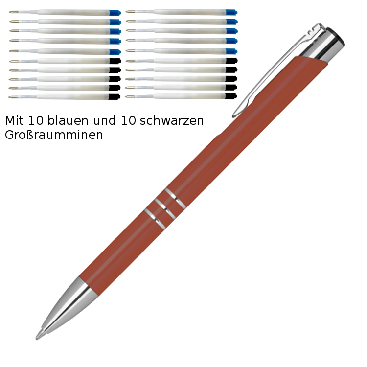 10 Kugelschreiber aus Metall / je 10 schwarze + blaue Minen / Farbe: kupfer