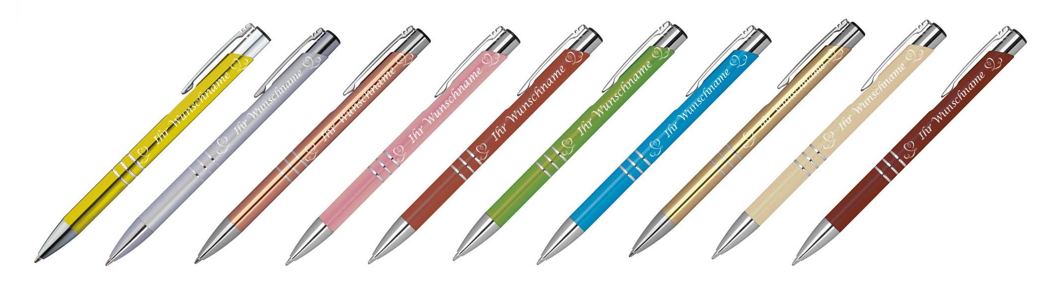 10 Kugelschreiber mit Gravur "Herzen" / aus Metall / 10 verschiedene Farben
