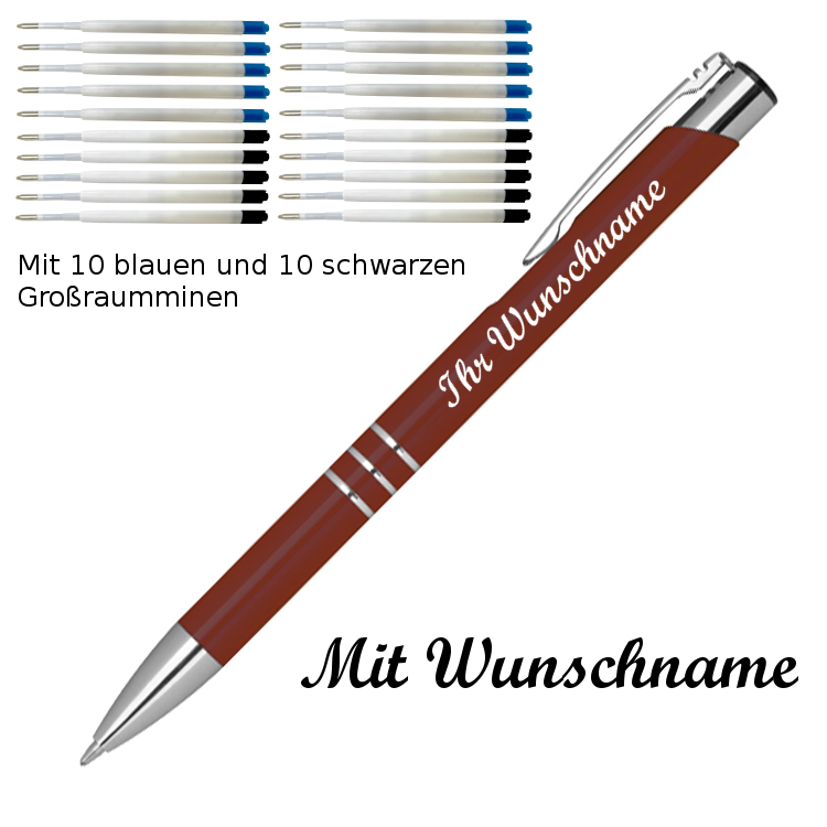 10 Kugelschreiber mit Namensgravur / je 10 schwarze + blaue Minen / bordeaux