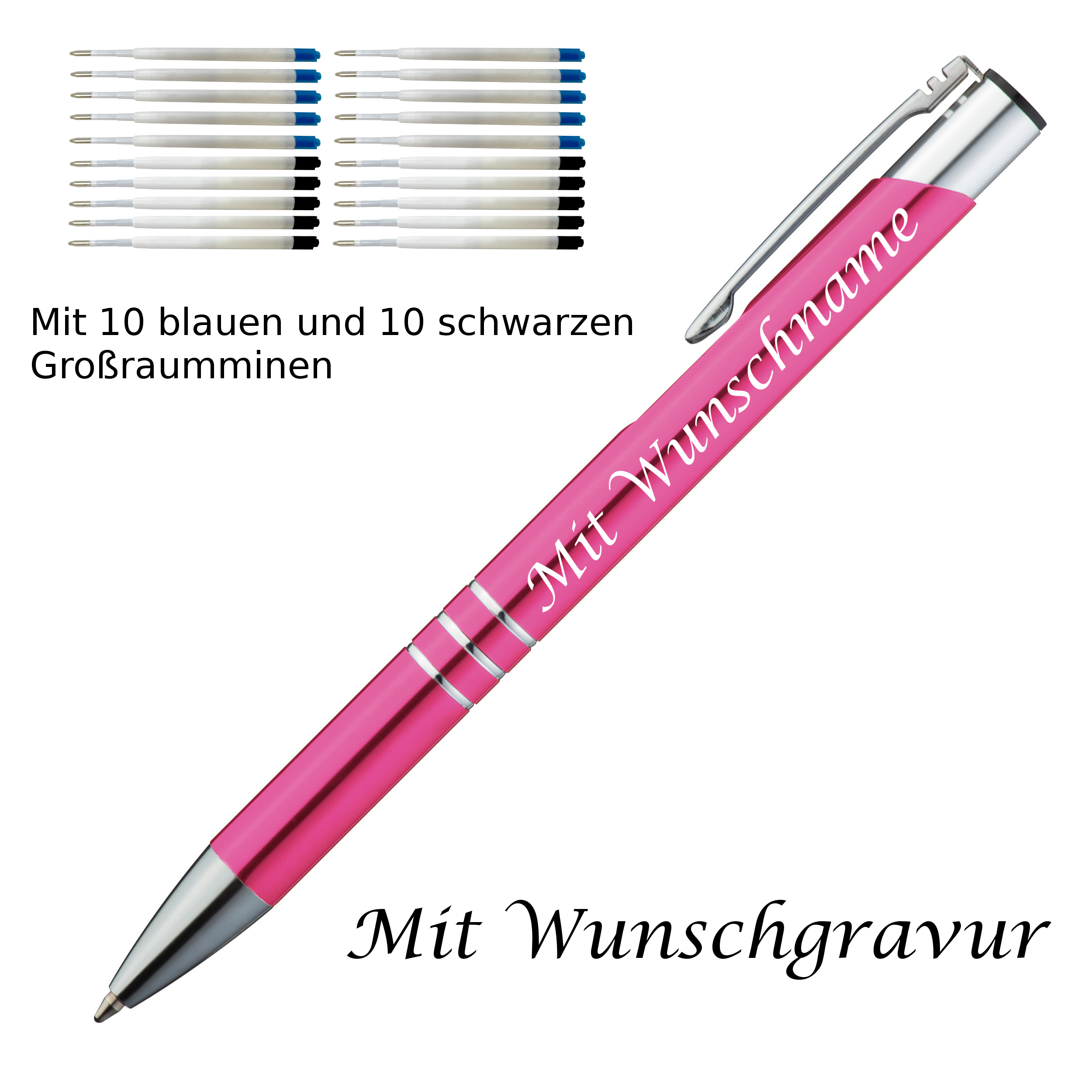 10 Metall Kugelschreiber mit Gravur / je 10 schwarze + blaue Minen / pink