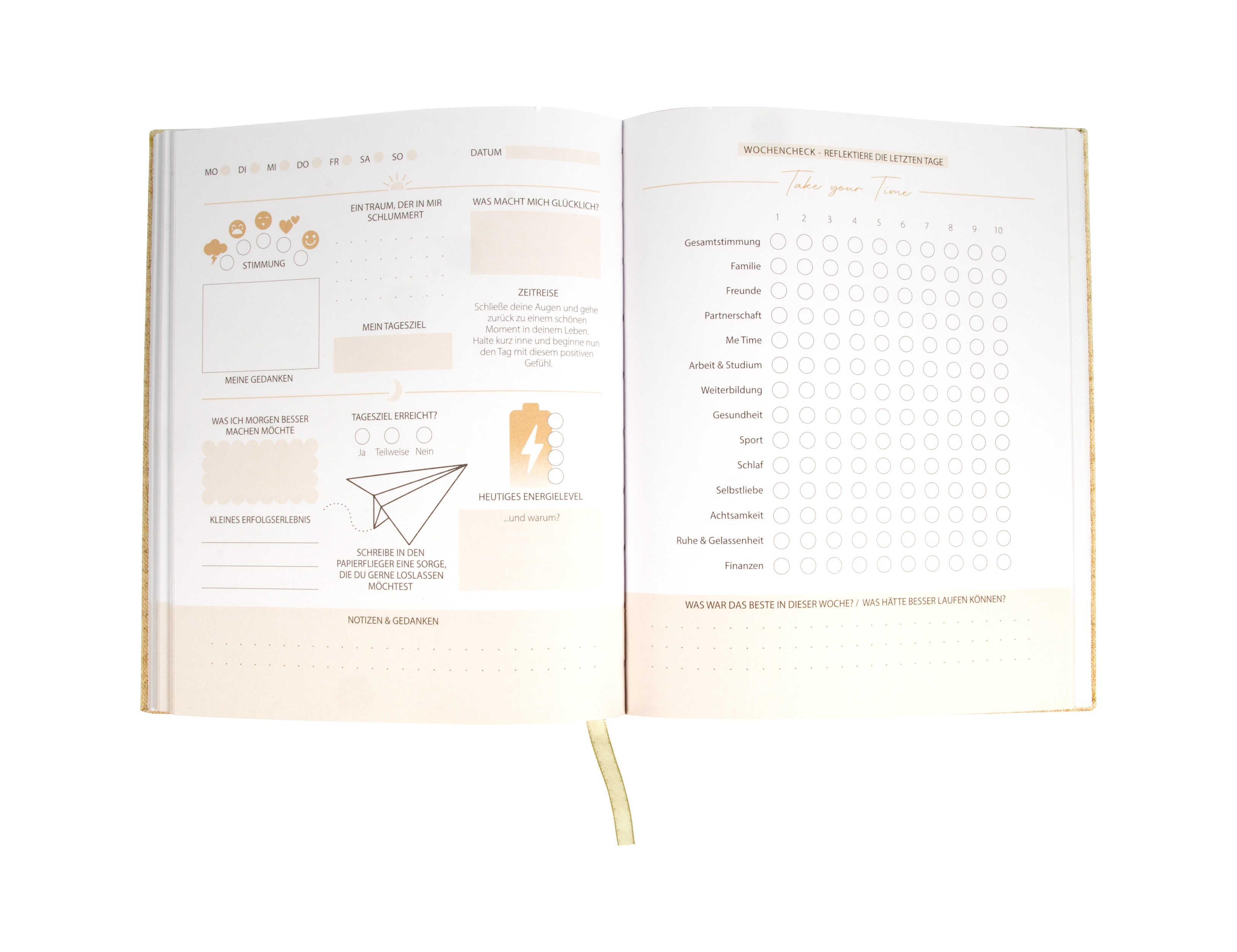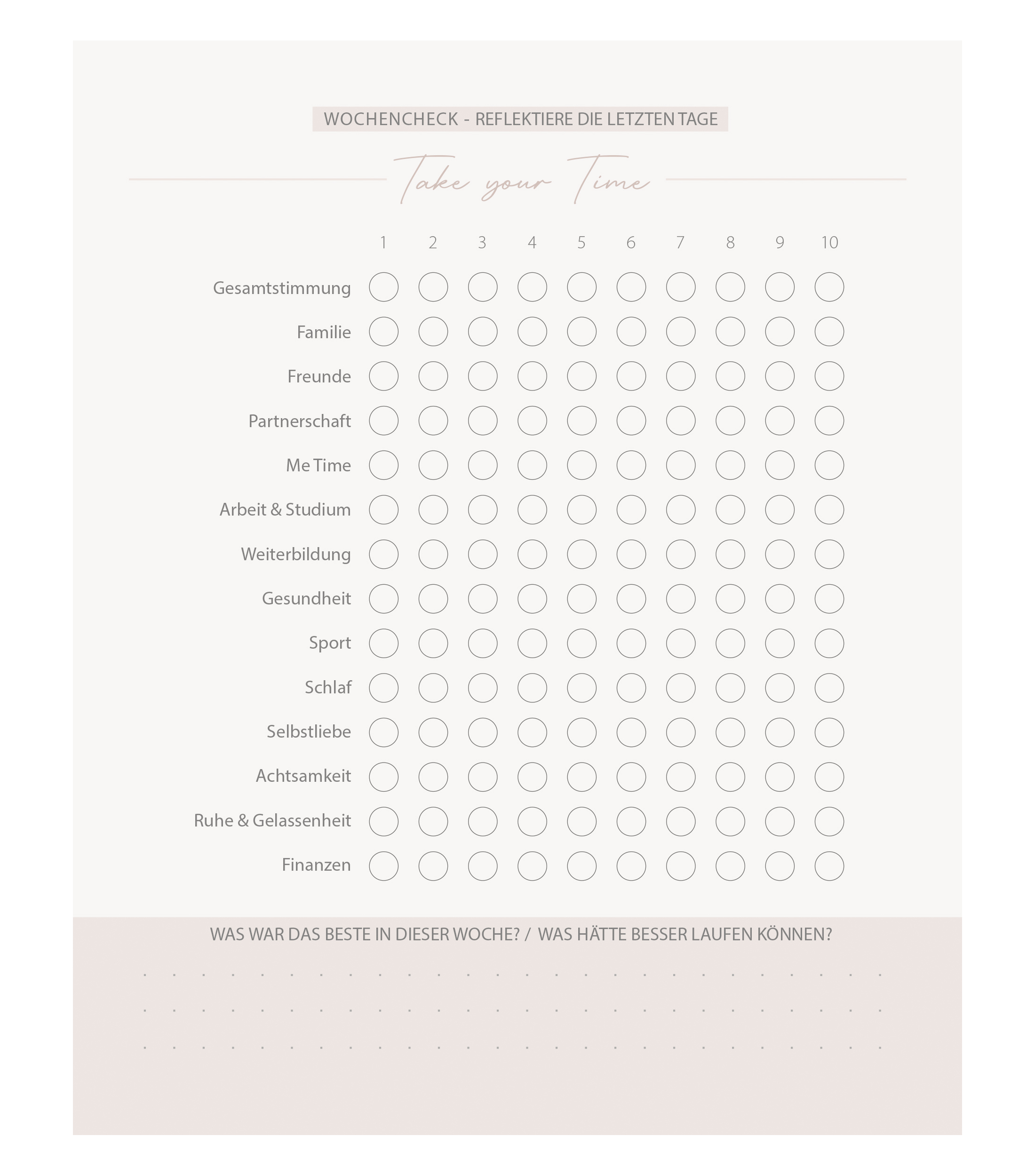 - Wochencheck & Reflexion, sowie Freiraum für Notizen und Ideen