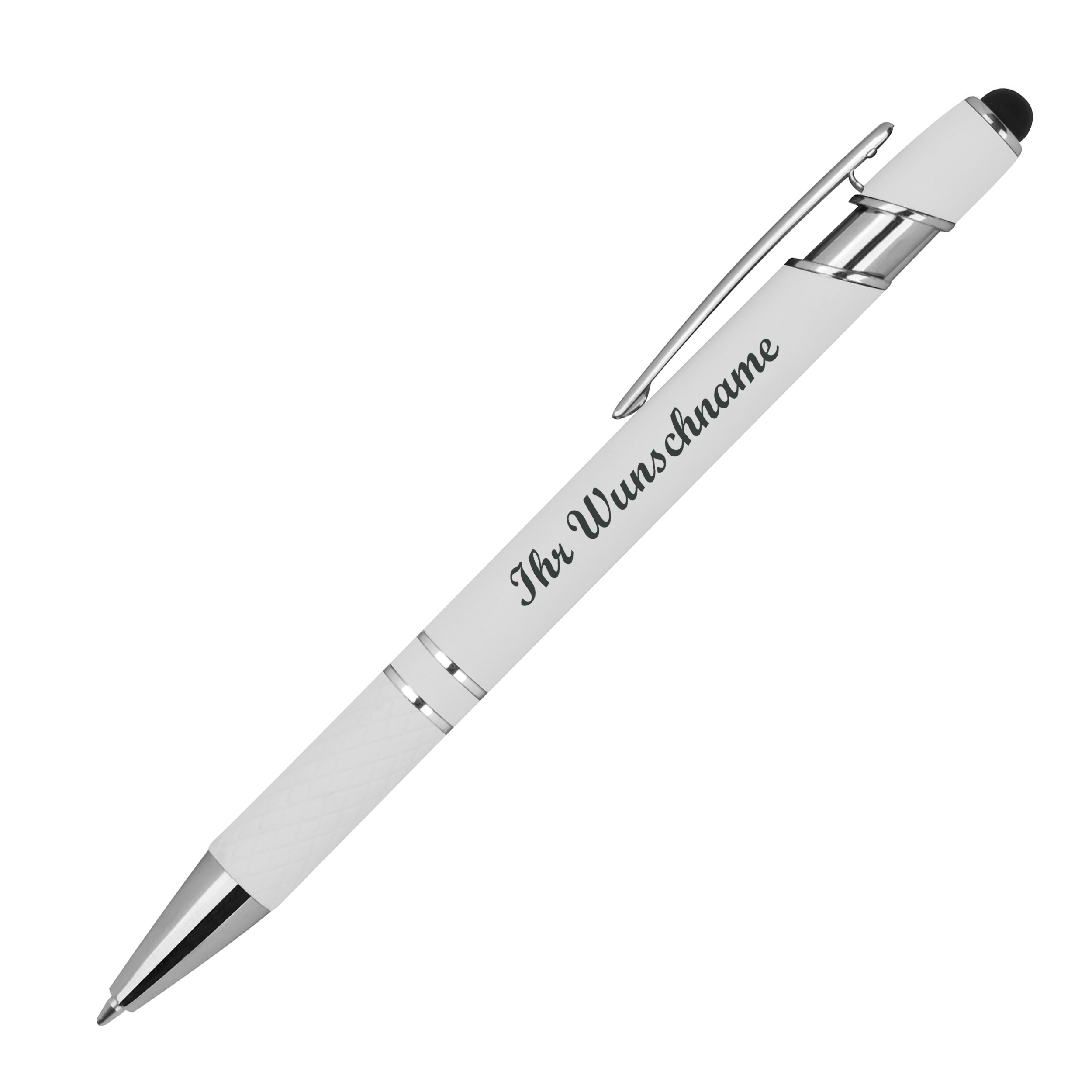 10 Touchpen Kugelschreiber aus Metall mit Namensgravur - mit Muster - weiß