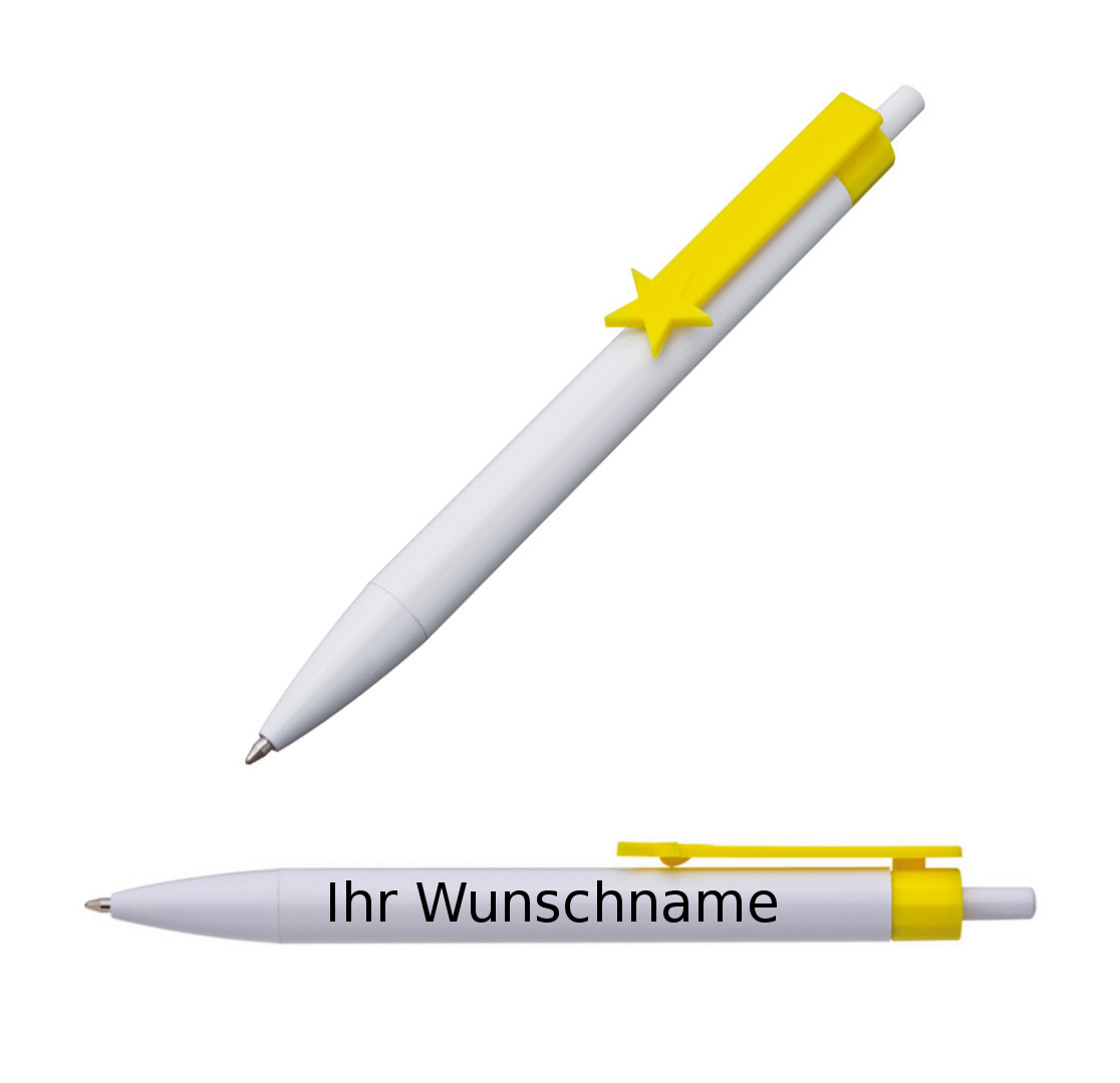 10x Druckkugelschreiber mit Gravur / "Stern" / Clipfarbe: gelb