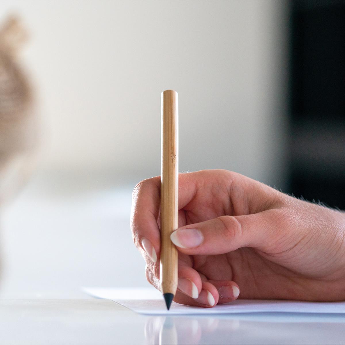 - nachhaltiges Schreibgerät aus Bambus ist nicht nur umweltfreundlich, sondern auch ein Zeichen von Eleganz und Stil. Dieses einzigartige Schreibgerät verwendet eine legierte Mine, deren Schrift auf dem Papier oxidiert, wodurch ein graues Schriftbild entsteht, das nicht radierbar ist.