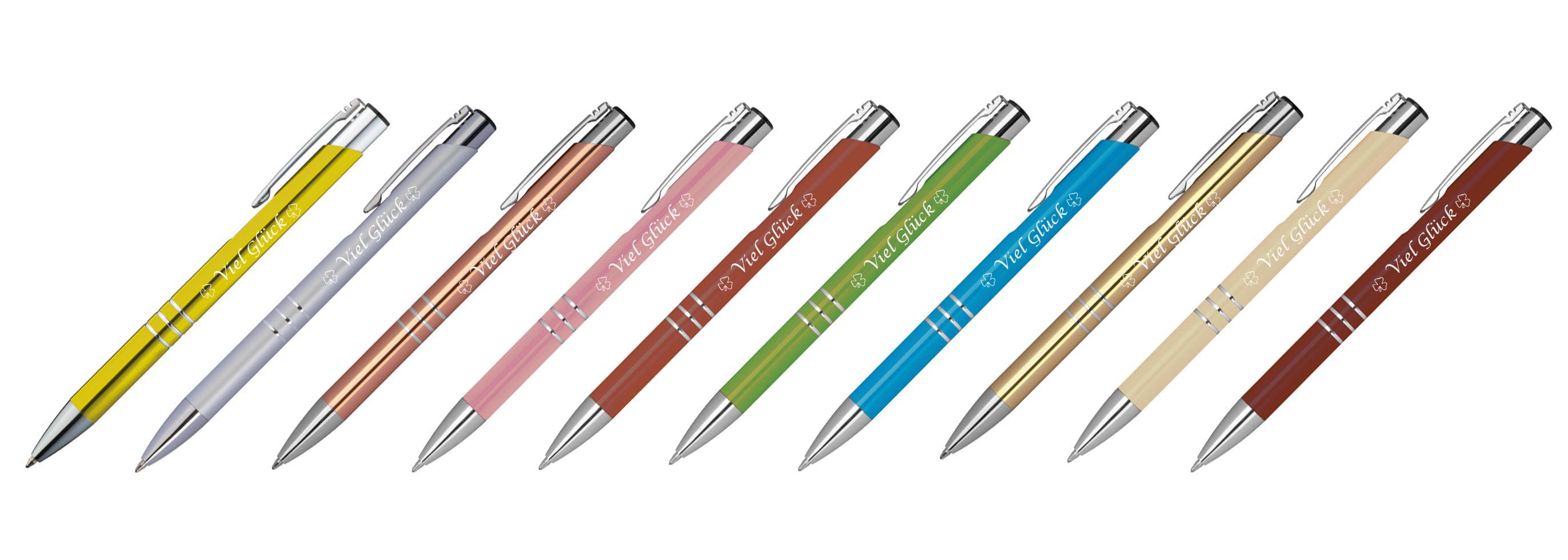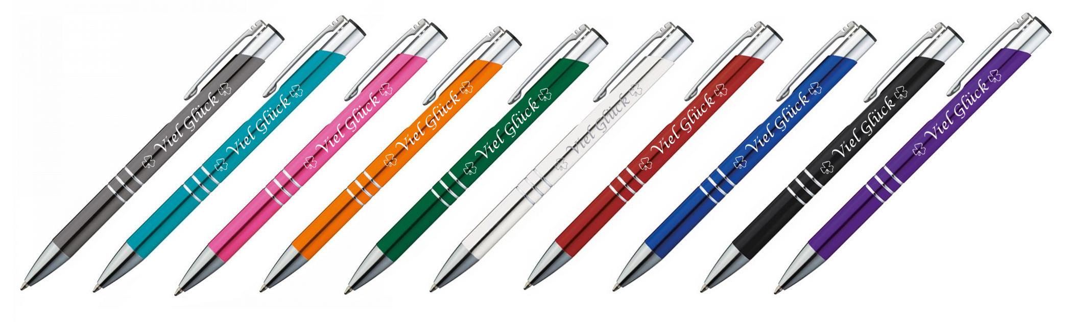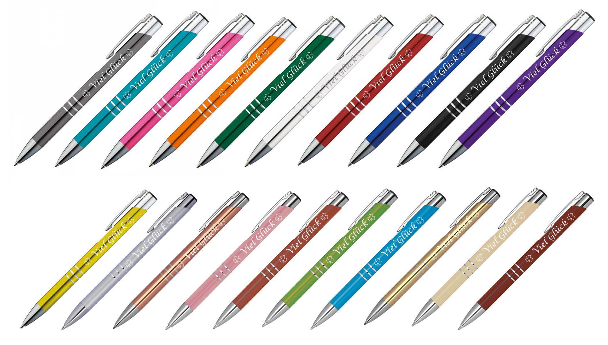 20 Kugelschreiber mit Gravur "Viel Glück" / aus Metall / 20 verschiedene Farben