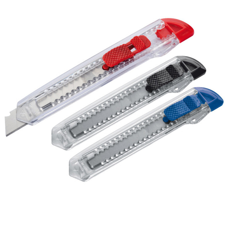 - transparentes Kartonmesser mit farbigem Endstück und abtrennbarer Feststellklinge