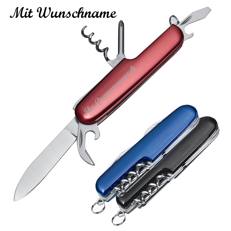 3x Edles 7-teiliges Taschenmesser mit Namensgravur - je 1x schwarz, blau, rot
