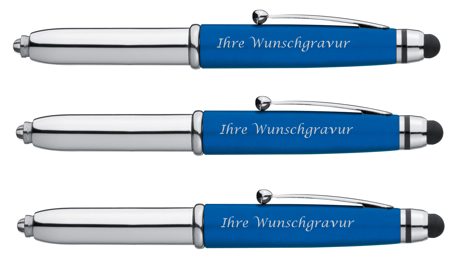 Produktinformationen "3x LED Touchpen Kugelschreiber mit Gravur / Farbe: silber-blau"