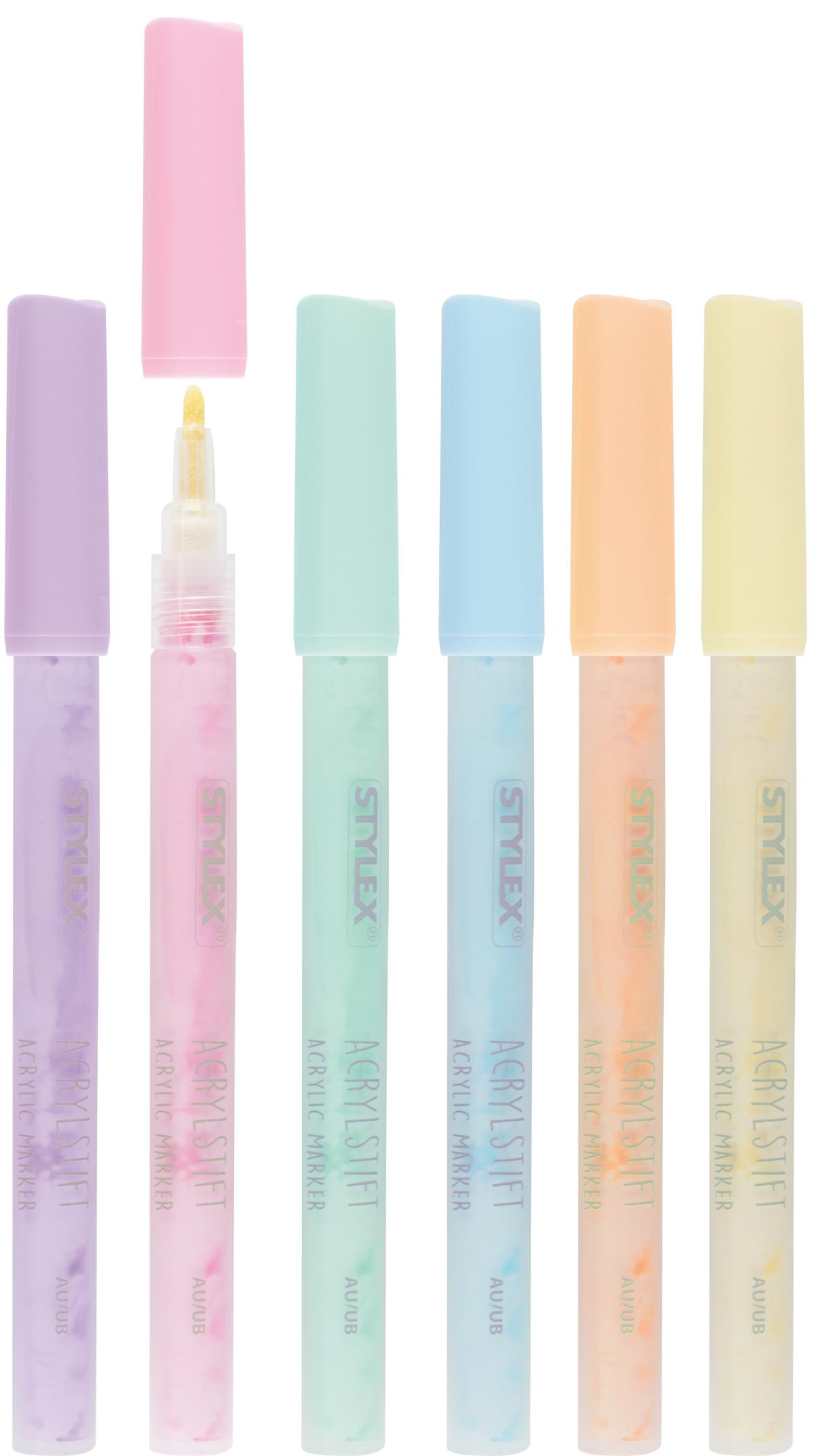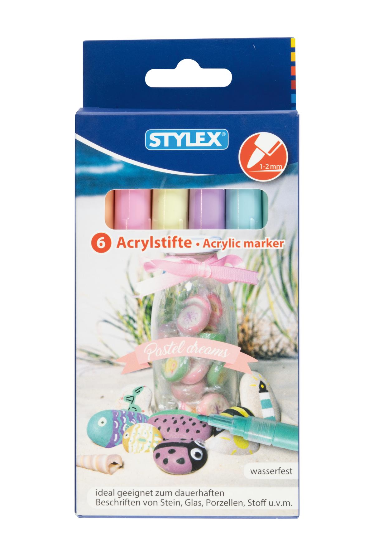 - Acrylstifte sind wasserfeste Stifte zum dauerhaften Beschriften von Stein, Glas, Porzellan, Stoff und vieles mehr. Die 6 Acrylstifte in den Pastell-Farben hellgelb, hellorange, Mint, Hellblau, Rosé, Flieder besitzen eine Strichstärke von ca. 1-2 mm und sind in einer praktischen Faltschachtel verpackt. Für die Anwendung wird der Stift zunächst gut durchgeschüttelt, damit sich die Farbe gut und gleichmäßig verteilen kann. Danach die Spitze einige male auf und ab drücken, sodass sich die Farbe in der Spitze verteilen kann. Zum Schluss den gewünschten Gegenstand bemalen und beschriften.