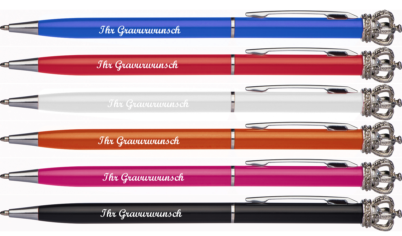 6x Drehkugelschreiber mit Namensgravur - aus Metall mit Krone - 6 versch. Farben