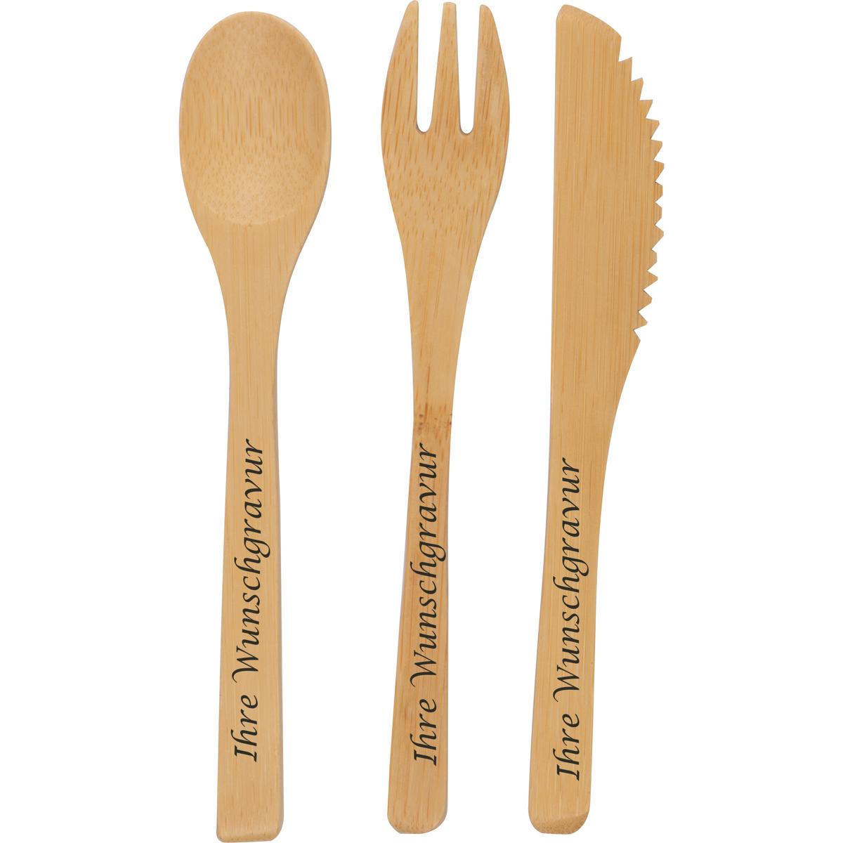 Bambus Besteck Set mit Gravur / im Baumwolletui mit Gabel, Messer und Löffel