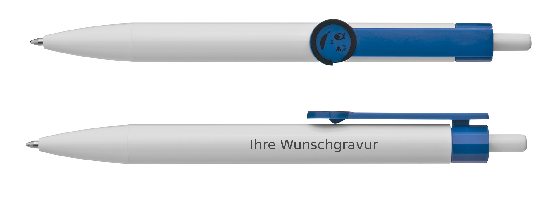 Druckkugelschreiber mit Gravur / mit Smile Gesicht / Clipfarbe: blau