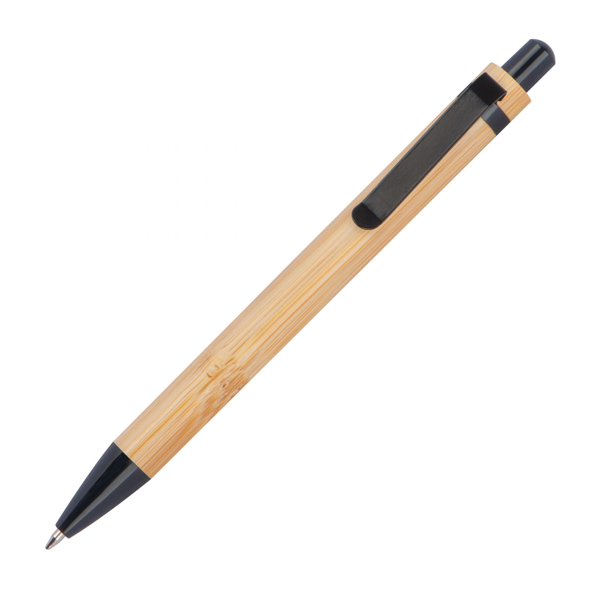 - der Kugelschreiber aus Bambus mit schwarzen Applikationen ist mit einer blauschreibenden Kunststoffgroßraummine ausgestattet