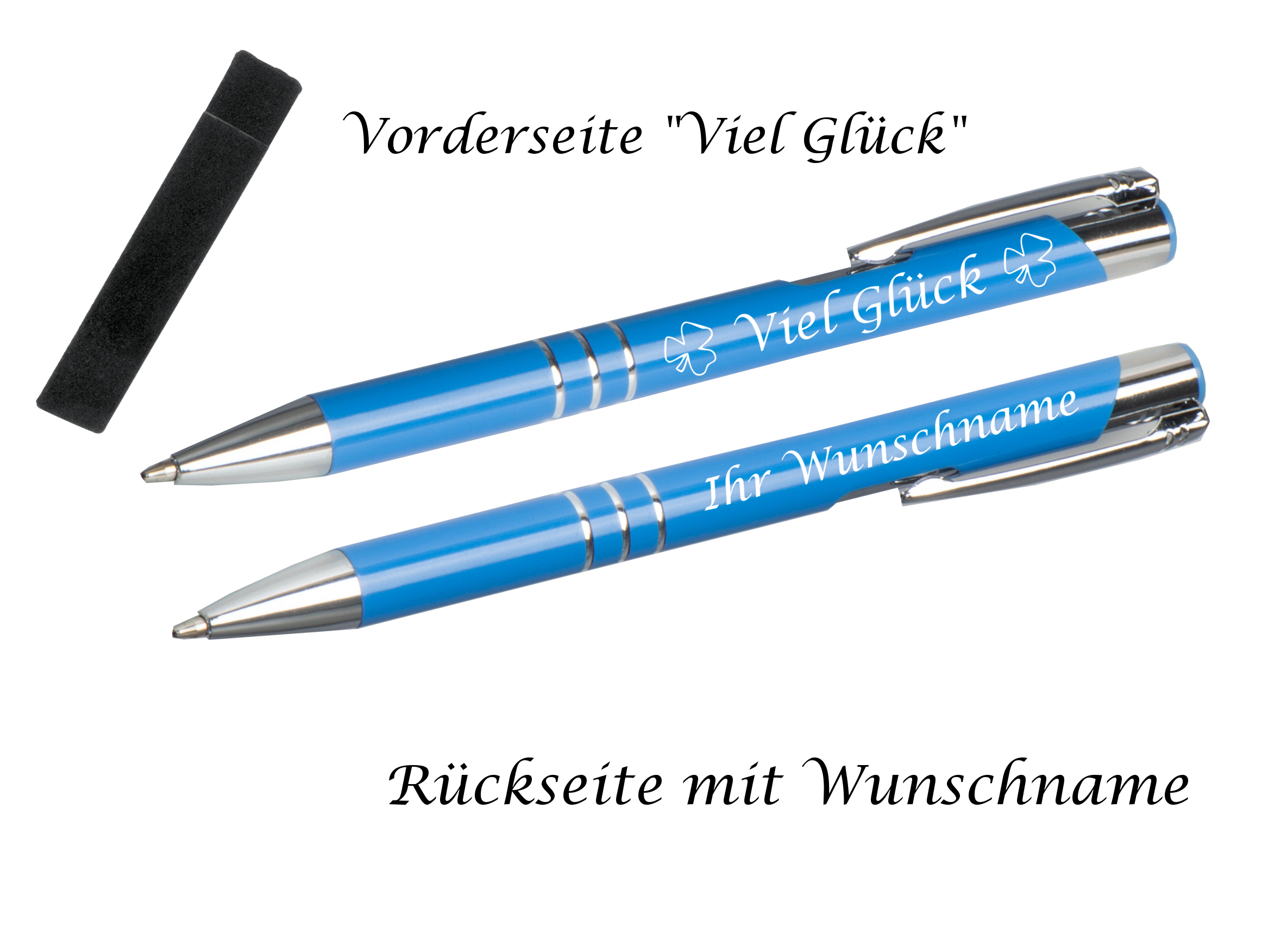 - Vorderseite wird mit 2 Kleeblätter und "Viel Glück" graviert und die Rückseite des Kugelschreibers mit Ihren Wunschtext oder Wunschnamen
