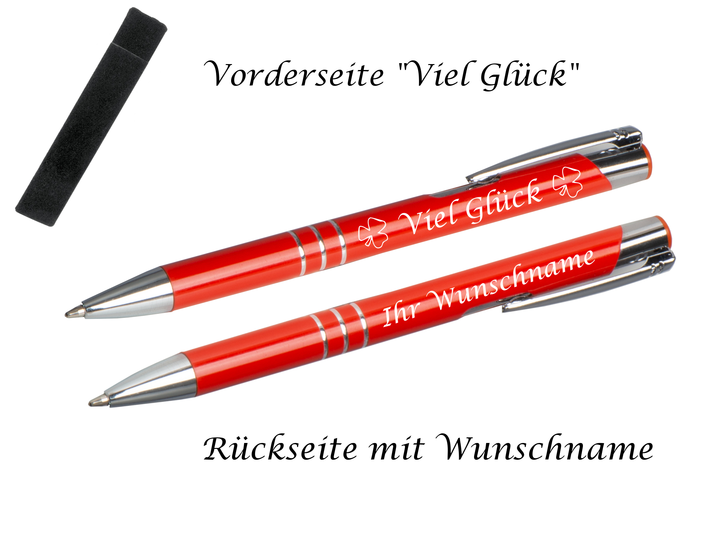 - Vorderseite wird mit 2 Kleeblätter und "Viel Glück" graviert und die Rückseite des Kugelschreibers mit Ihren Wunschtext oder Wunschnamen