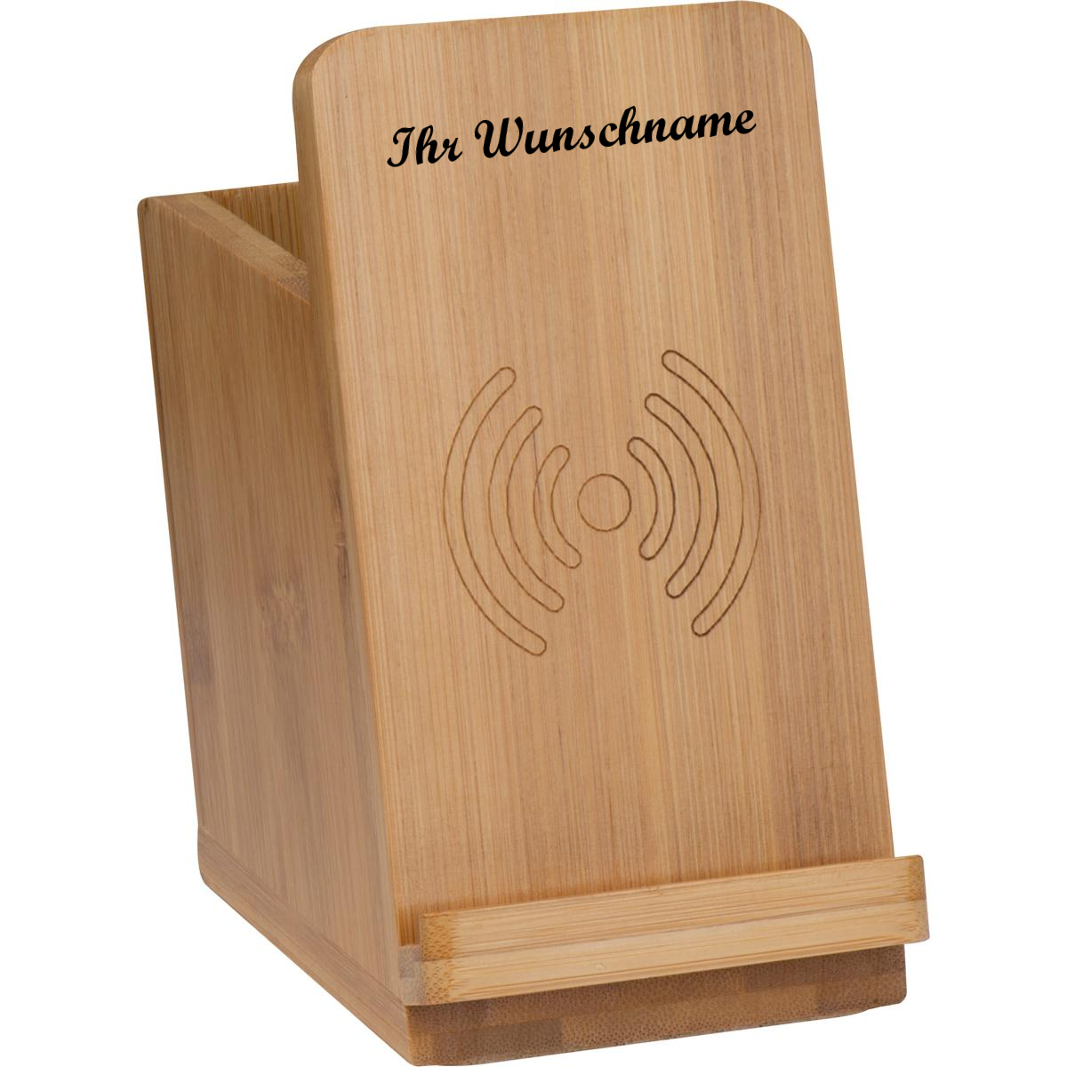 Induktionsladegerät aus Bambus mit Stifteköcher mit Namensgravur