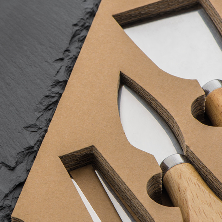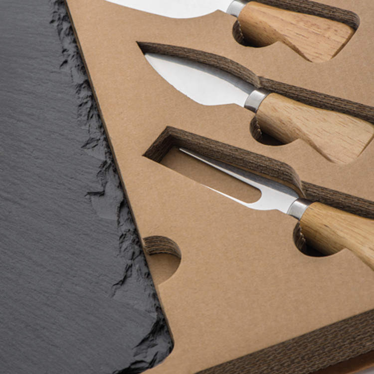 - mit einer Schieferplatte, einem kleinen und einem flachen Käsemesser sowie einer Käsegabel aus Edelstahl