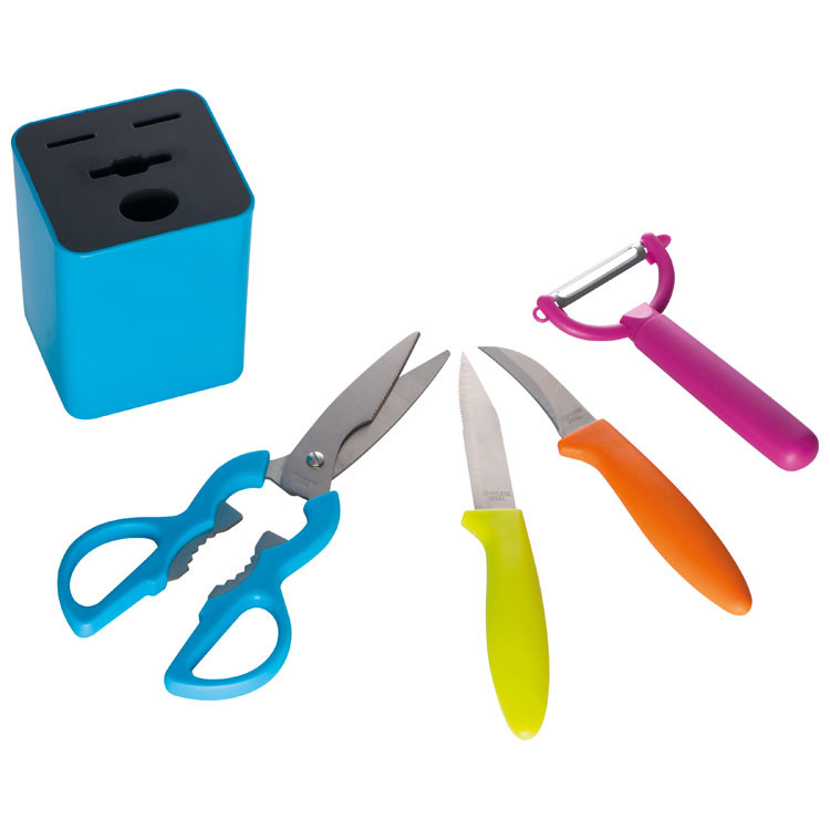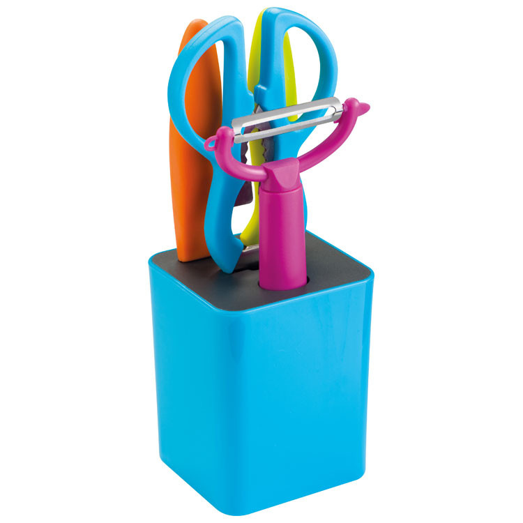 - der perfekte Küchenhelfer aus Kunststoff bietet einen Sparschäler, eine Schere mit Aufschraubhilfe sowie ein Schäl- und ein Gemüsemesser