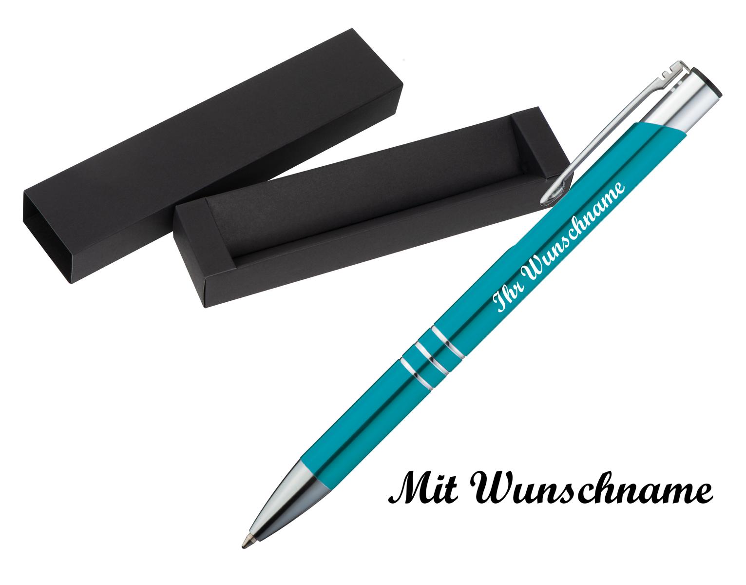 Kugelschreiber aus Metall mit Namensgravur - mit Pappetui - Farbe: türkis