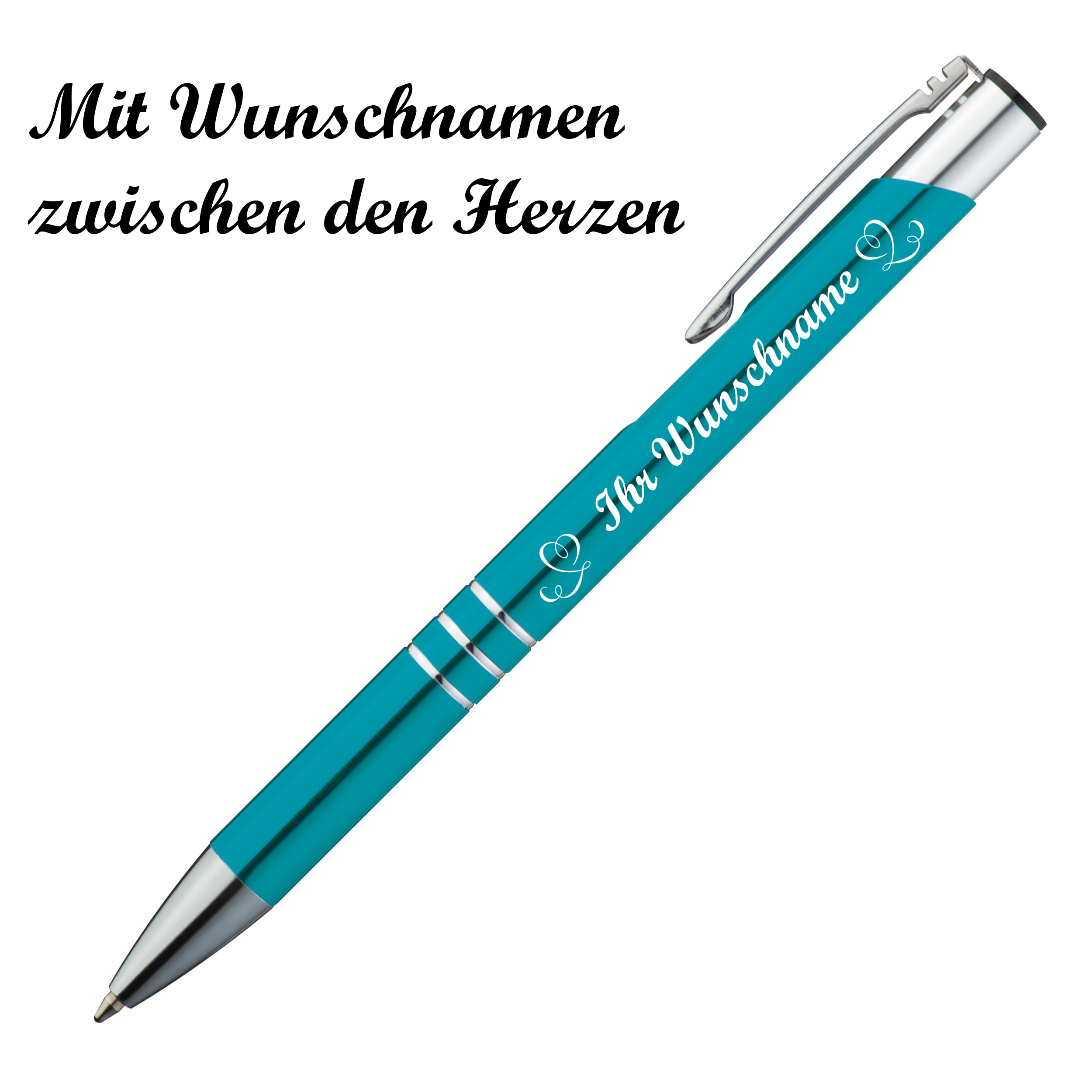 Kugelschreiber mit Namensgravur "Herzen" - aus Metall - Farbe: türkis
