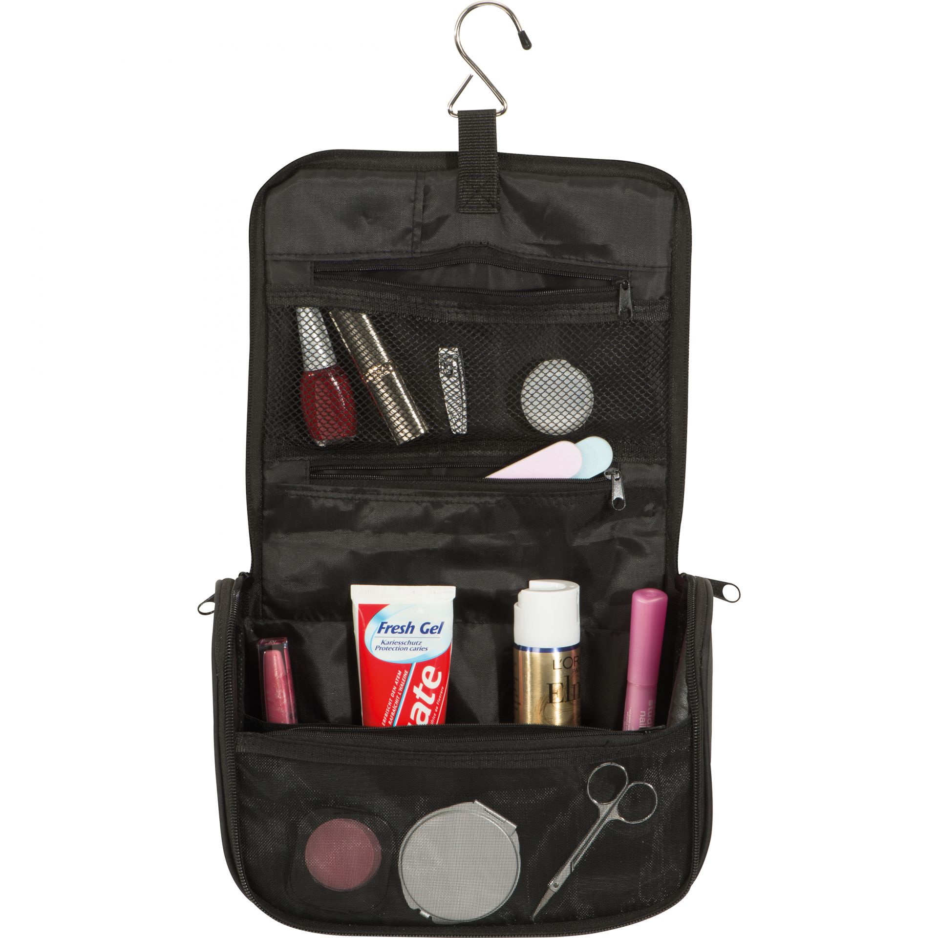 - mit einem großen Innenfach, drei Reißverschlussfächern, vier Gummibändern und einem Haken zum Aufhängen