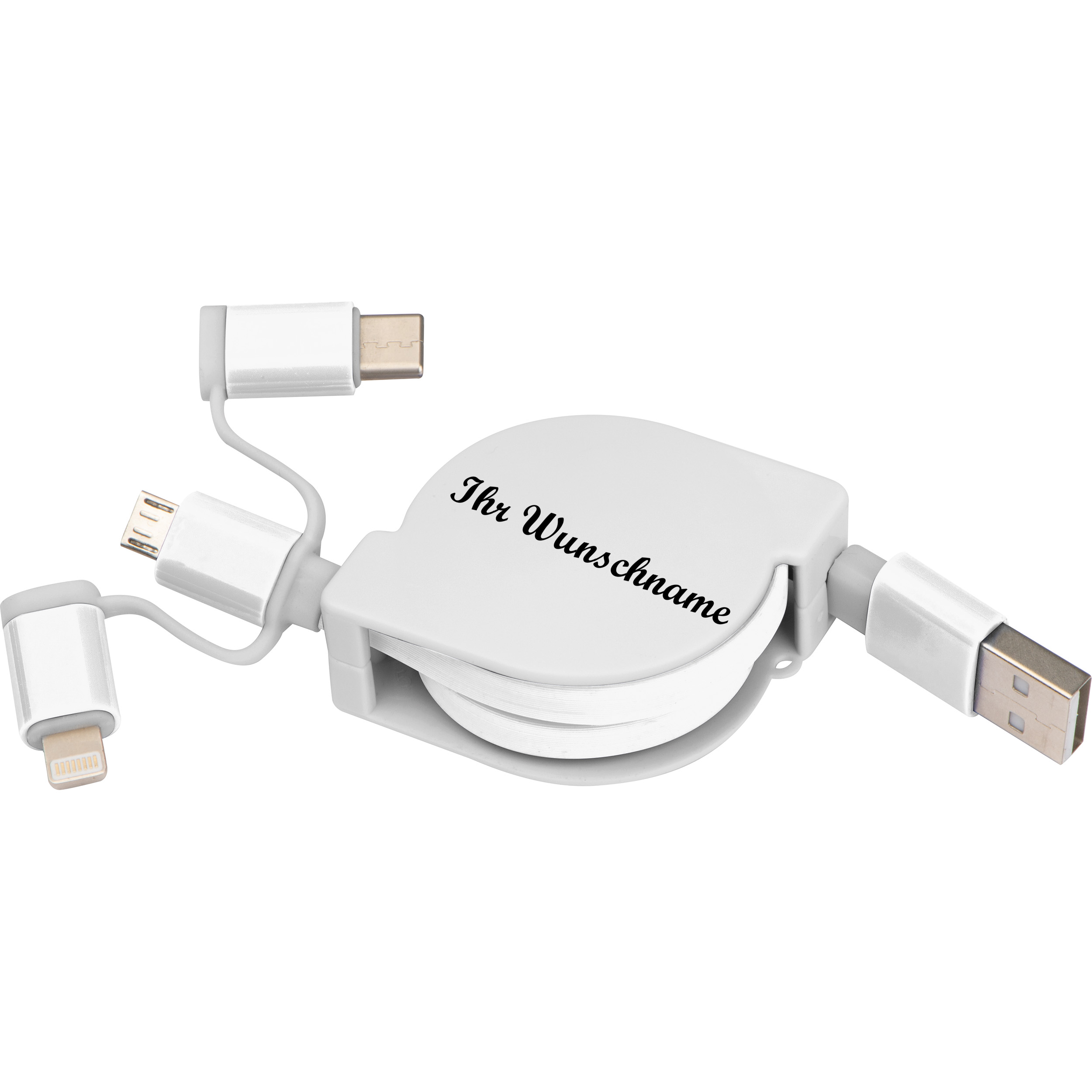 Produktinformationen "Ladekabel mit iOS, C-Type und Micro USB Anschluss mit Namensgravur - Farbe: weiß"