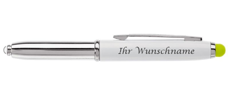 LED Touchpen Kugelschreiber mit Gravur / Farbe: silber/weiß mit grünen Stylus