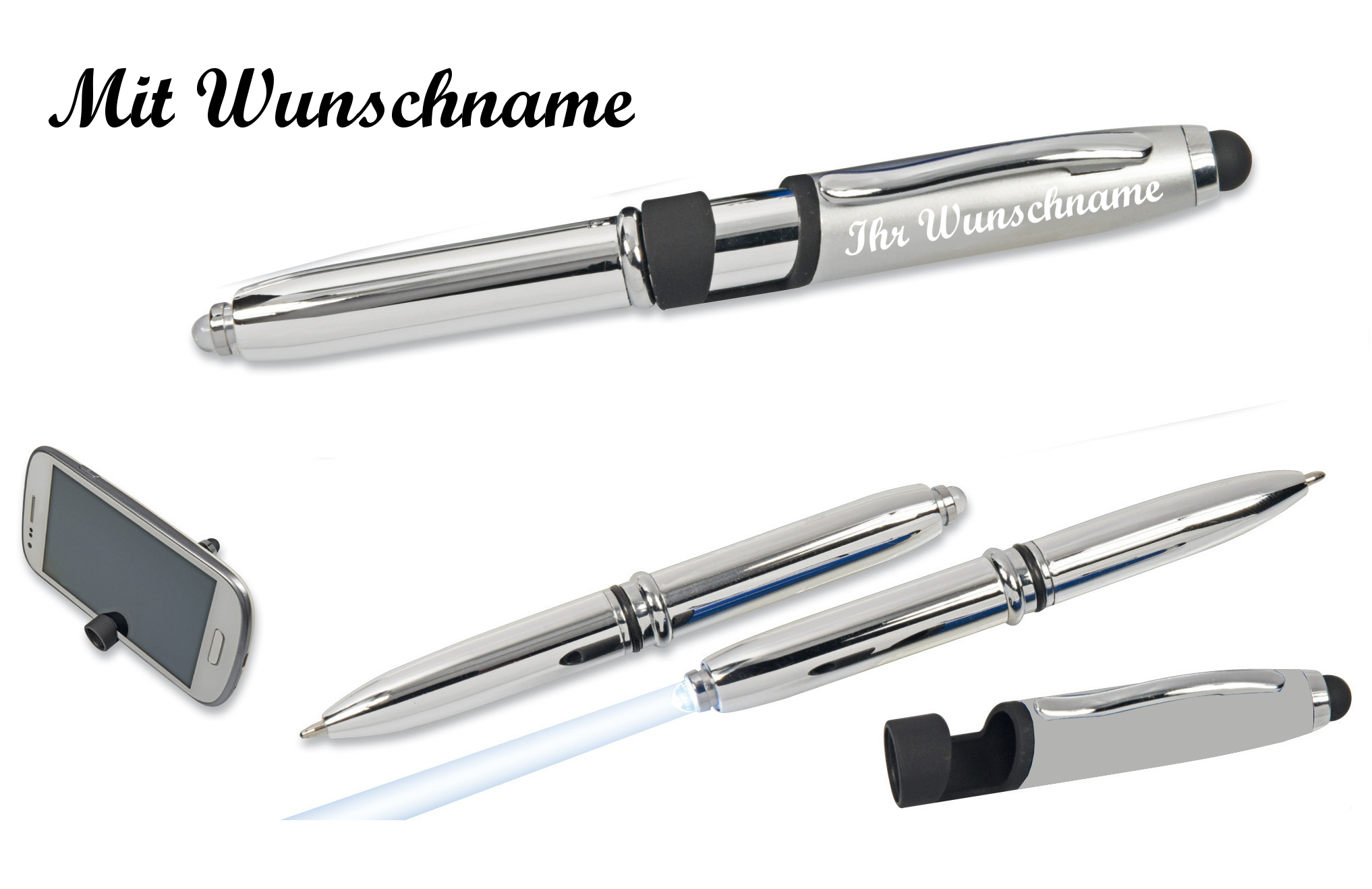 LED Touchpen Kugelschreiber mit Namensgravur - mit Smartphone Halterung - silber