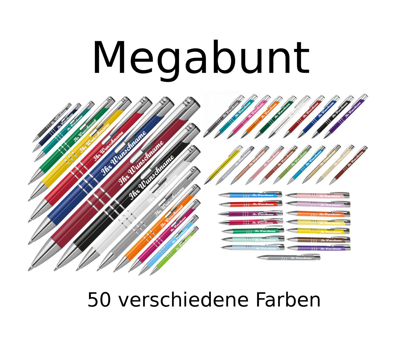 MEGABUNT 50 Metall-Kugelschreiber mit 50 verschiedene Farben mit Namensgravur