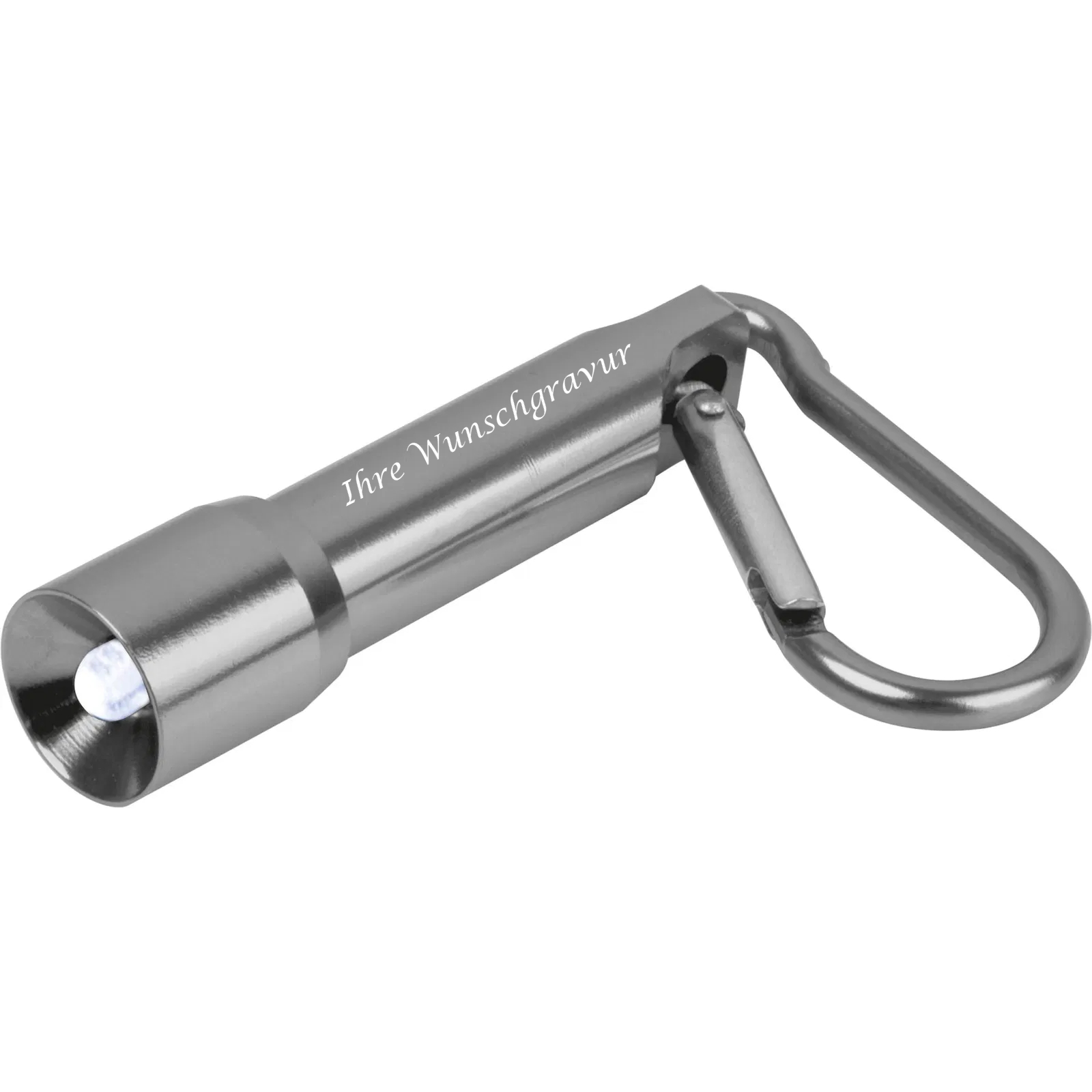 Mini-Taschenlampe mit Gravur / aus Metall / mit Karabinerhaken / Farbe: silber