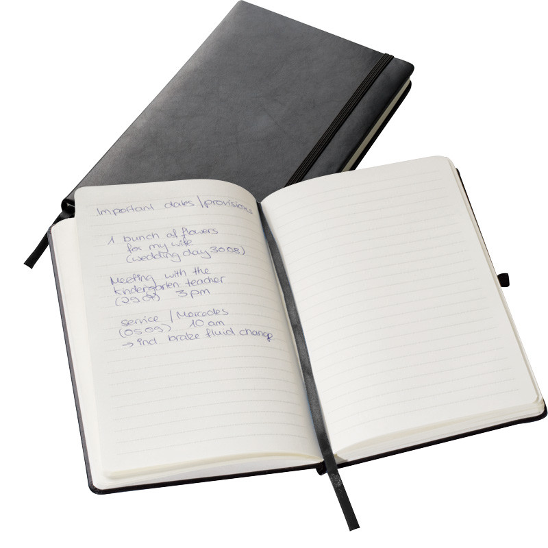 - mit Gummiband-Verschluss, Kugelschreiberschlaufe, Lesebändchen und einer Falttasche im hinteren Buchdeckel
