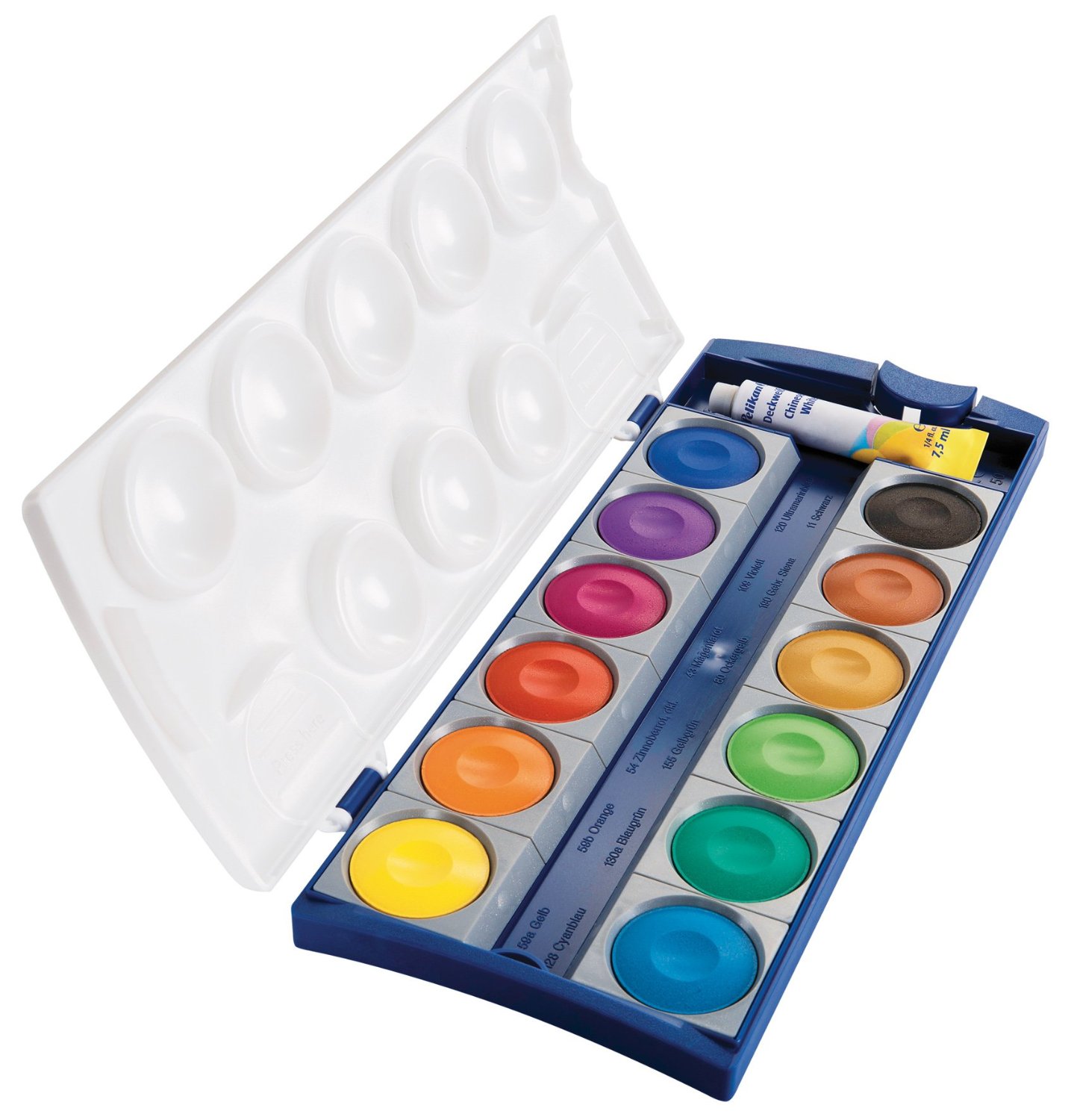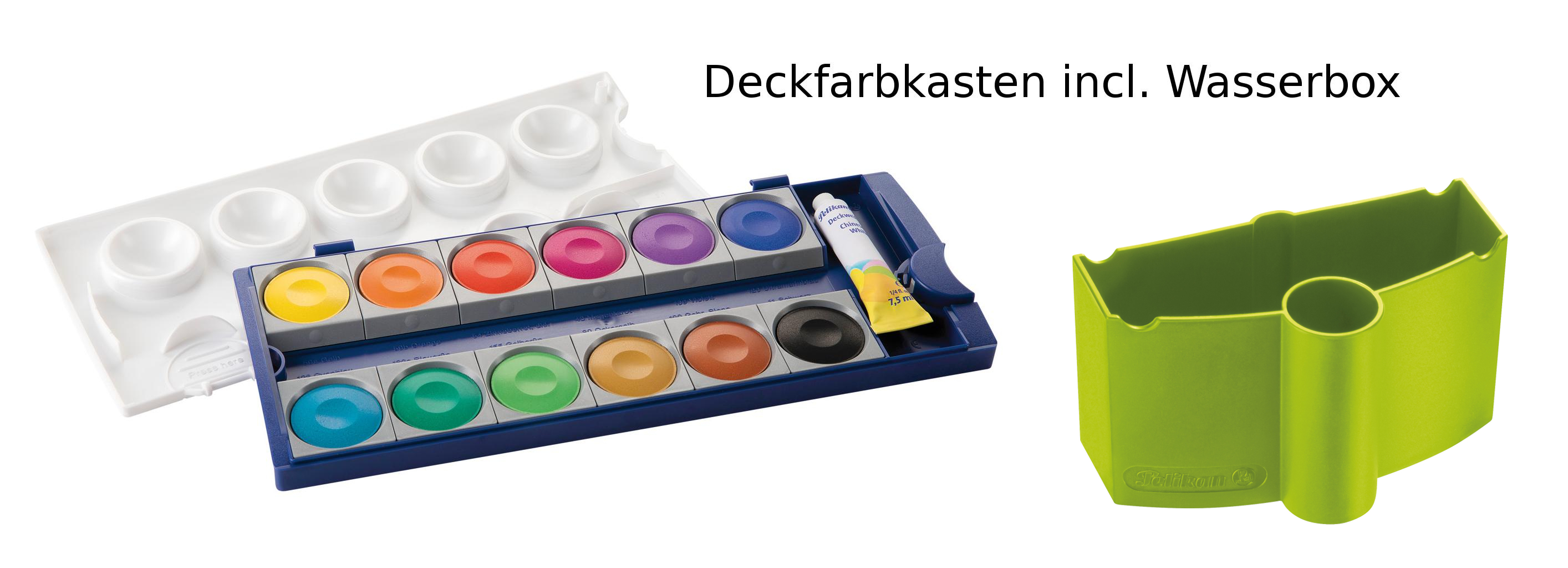 - Deckfarbkasten mit 1 Tube Deckweiß und 12 verschiedene Qualitätsfarben. Der Deckel ist abnehmbar mit großen Mischtöpfen.
