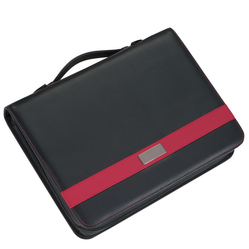 - mit finest Bonded Leather (Lederfaserstoff), verschiedenen Gummischlaufen und Einsteckfächern, Ringbucheinlage, Schreibblock (60 Seiten), Tablet- / Smartphonehalterung, Handyfach, Tragegriff und Reißverschluss