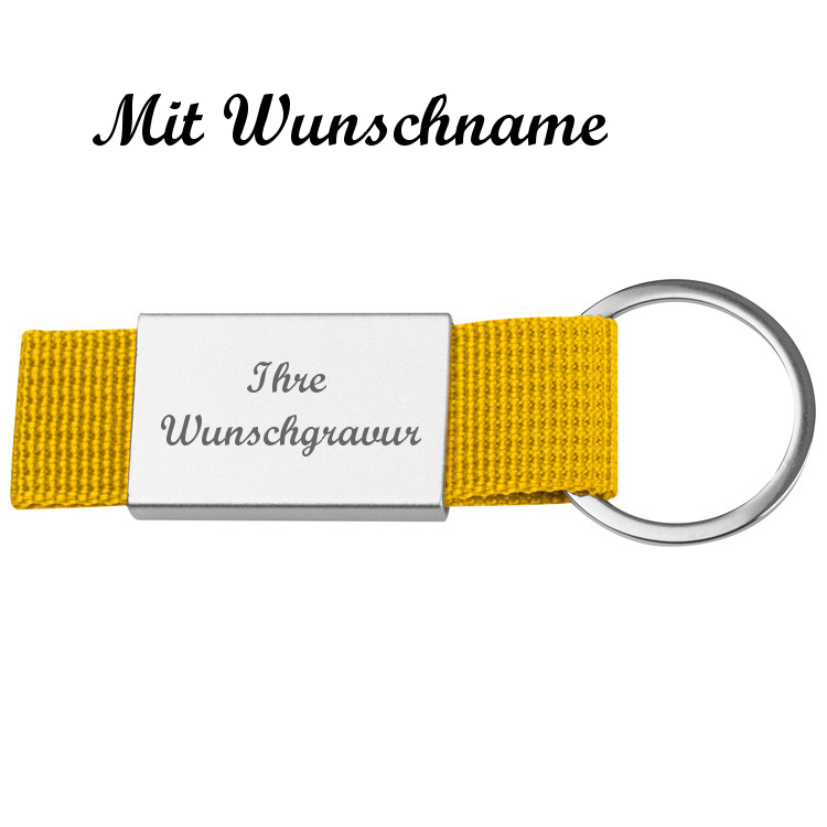 Schlüsselanhänger mit Namensgravur - mit gelben Stoffbändchen