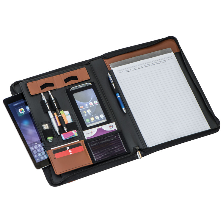 - aus hochwertigem Lederfaserstoff mit Steckfach, Visitenkartenfächern, Kugelschreiberschlaufen, Smartphonehalterung, Aufbewahrungsfach für Tablet oder Notebook, Reißverschluss und liniertem Block mit kleinem Kalendereindruck