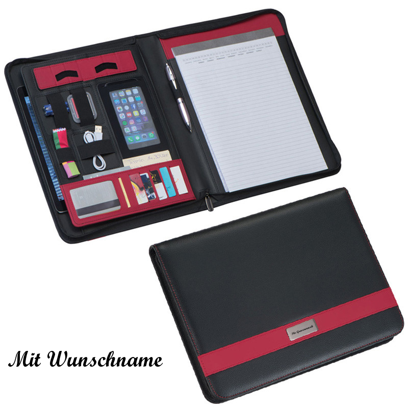 - mit finest Bonded Leather (Lederfaserstoff) diversen Einsteckfächern und Gummischlaufen, Schreibblock (60 Seiten), Tablet- / Smartphonehalterung, Handyfach und Reißverschluss