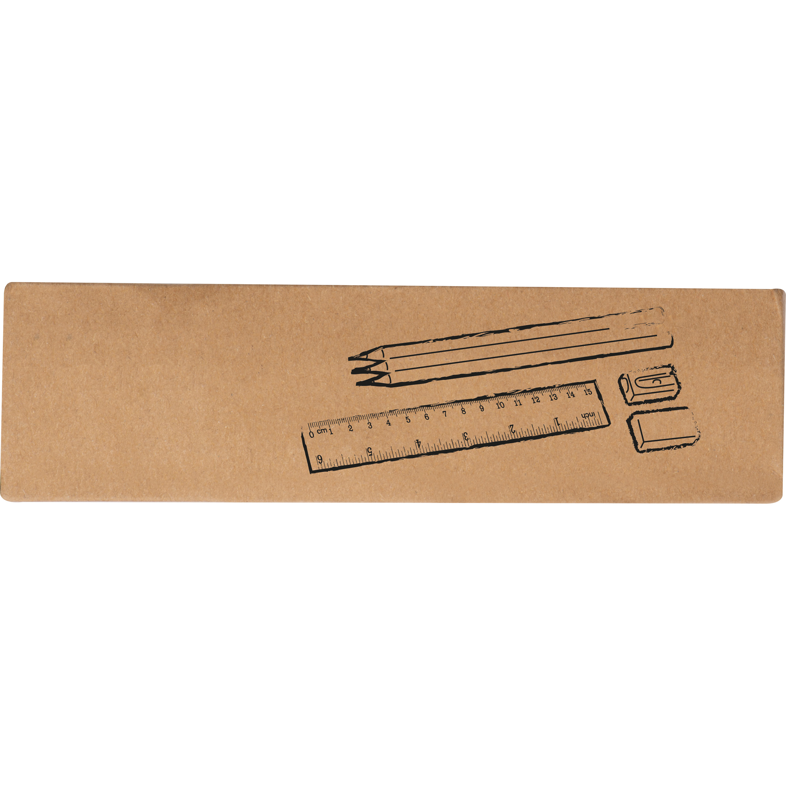 - mit 3 Bleistifte mit verschiedenen Härtegraden, Spitzer, Radiergummi und gravierten Lineal