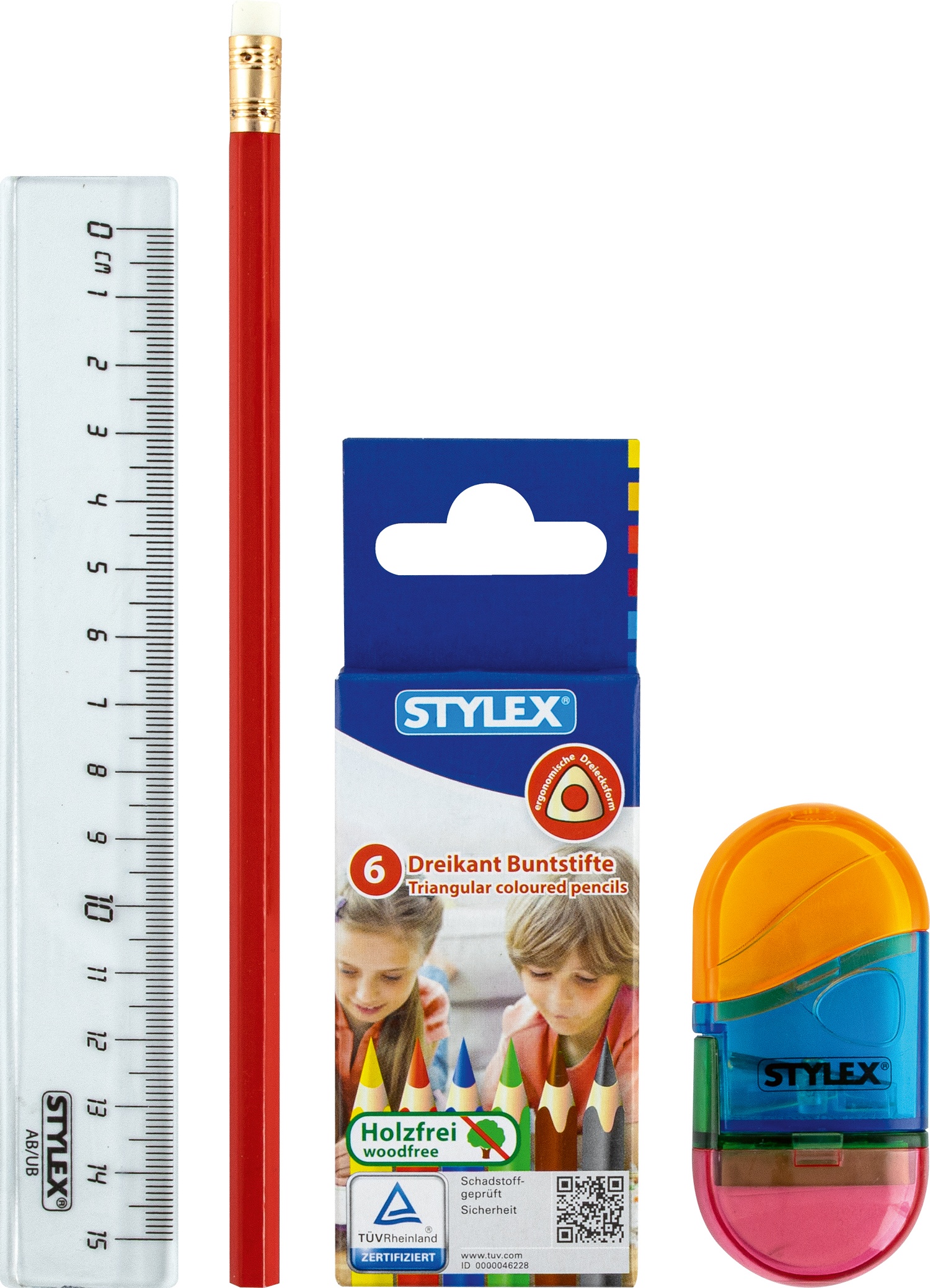 - Füllung besteht aus: Lineal, Bleistift, Anspitzer mit Radiergummi und 6 Buntstifte