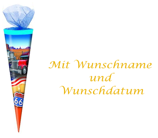 Schultüte mit gold gefärbter Gravur / 35cm / rund / Tüllverschluss / "Trucks"