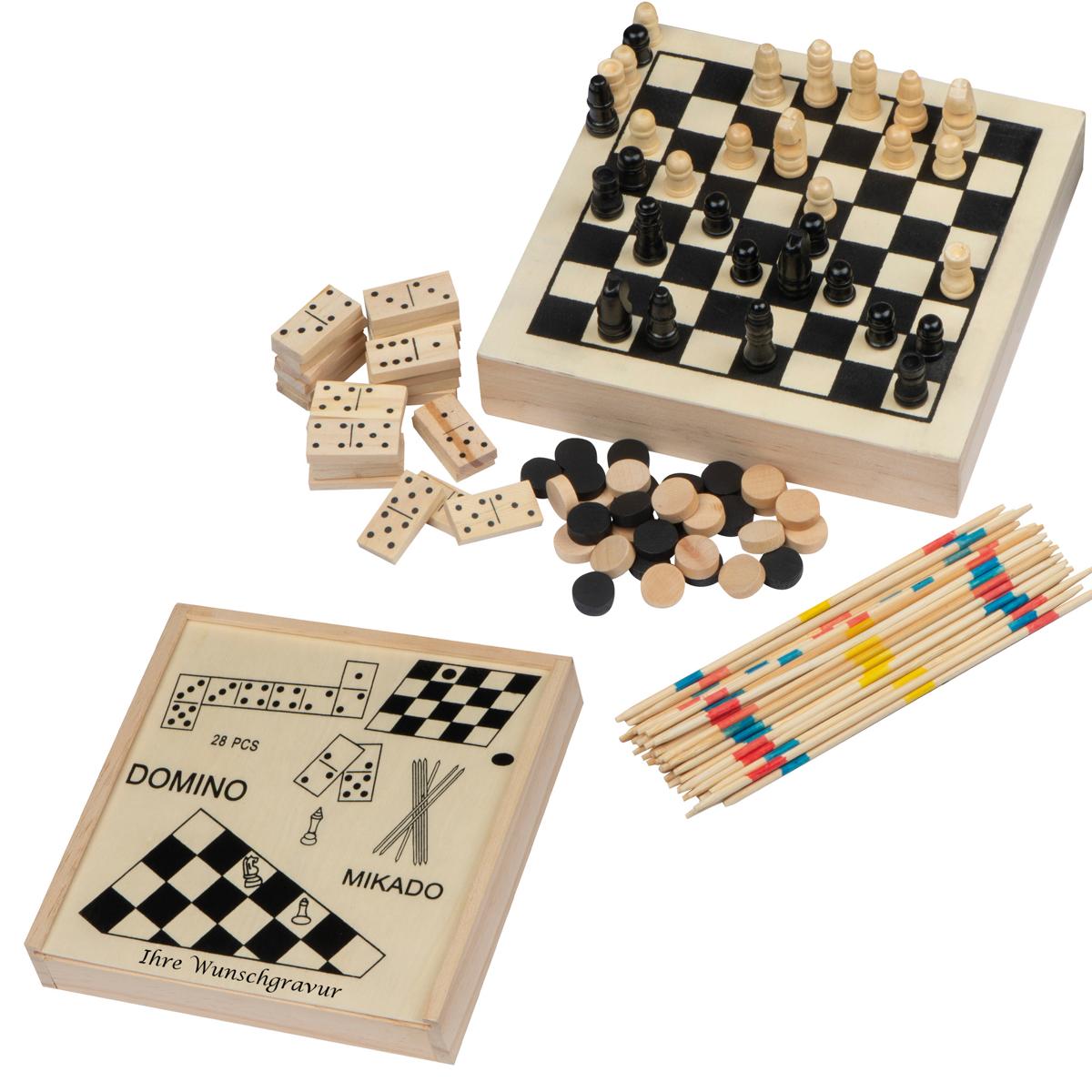 Spieleset in einer Holzbox mit Schach, Mikado, Dame, Domino mit Gravur