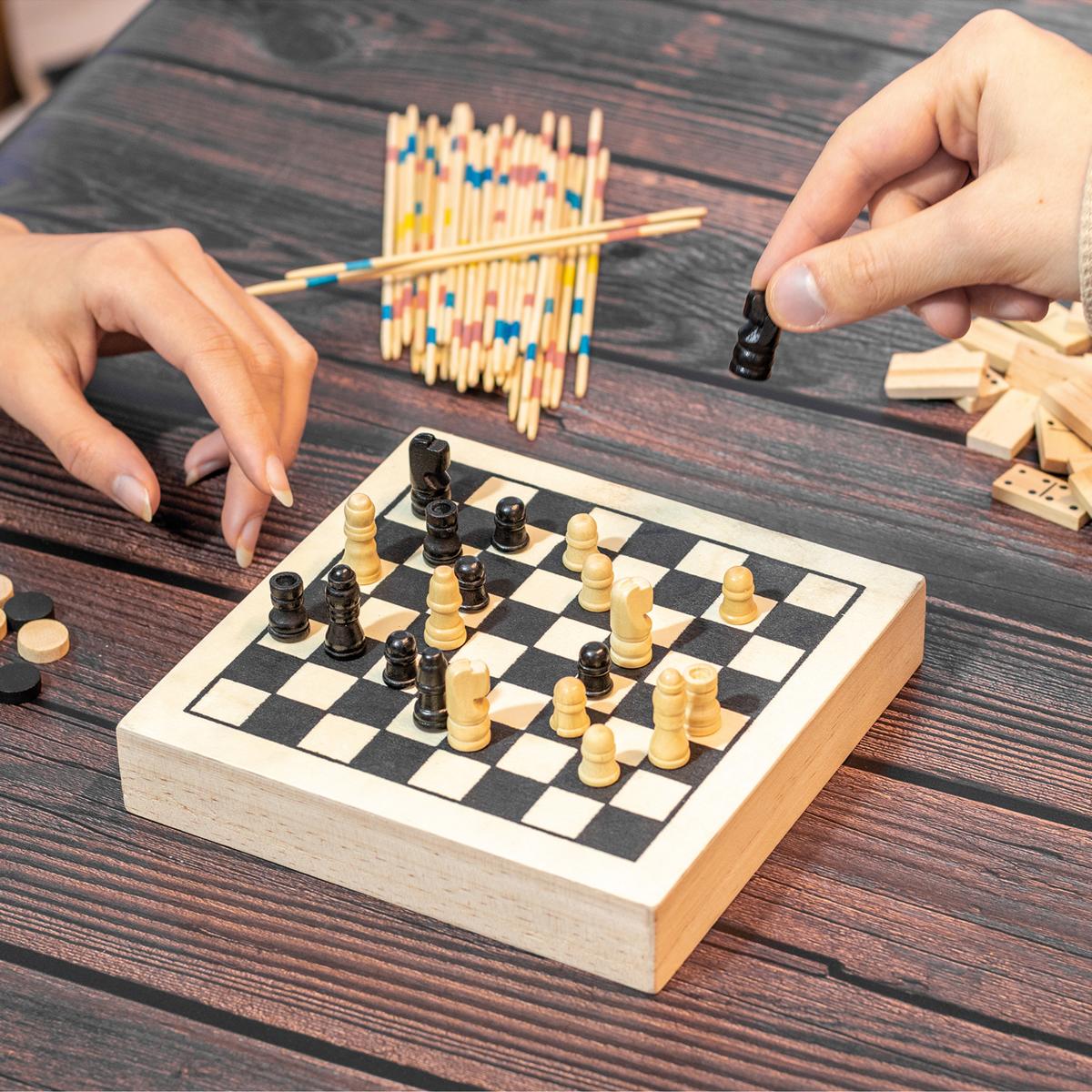Spieleset in einer Holzbox mit Schach, Mikado, Dame, Domino