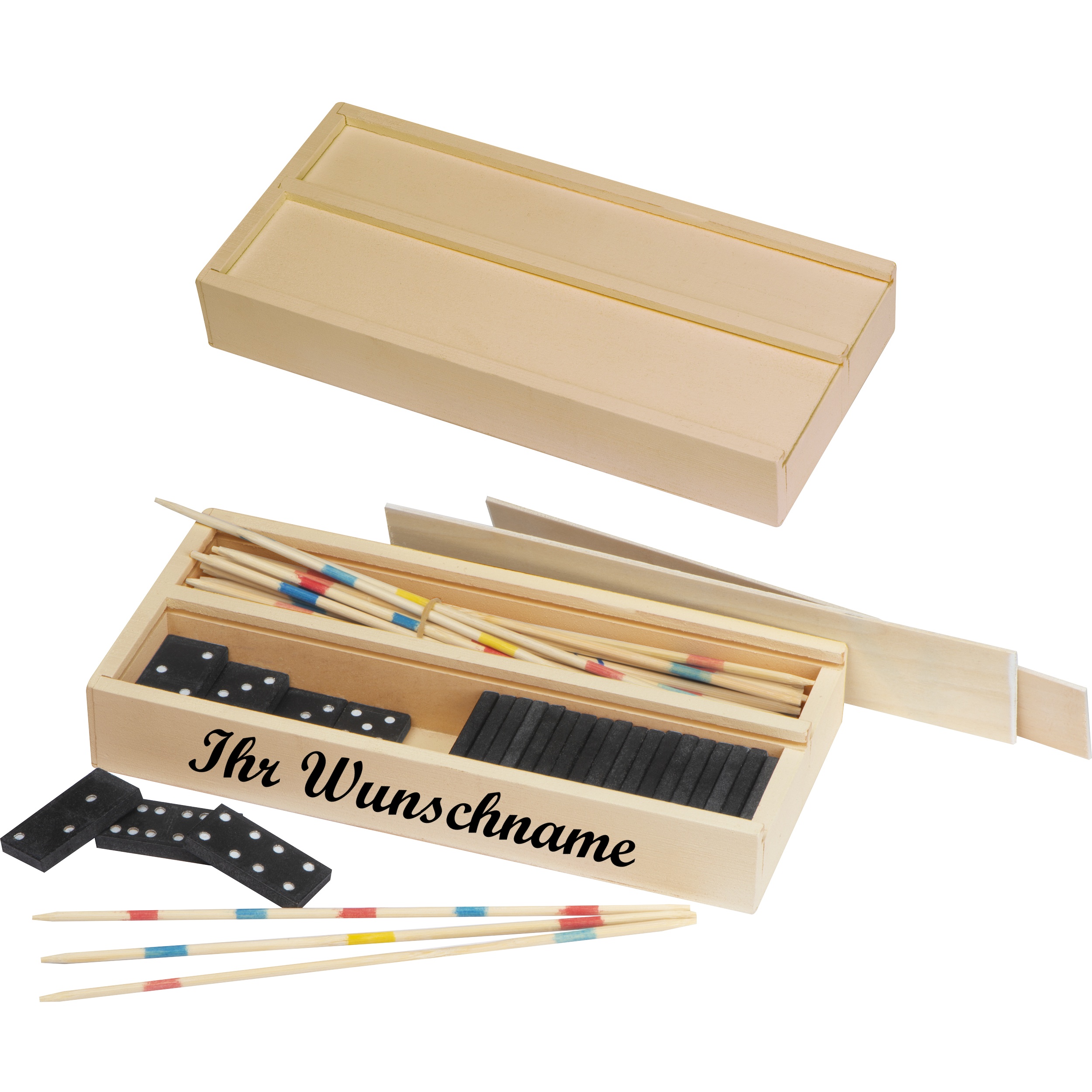 Spieleset mit Namensgravur - in einer Holzbox mit Mikado und Domino
