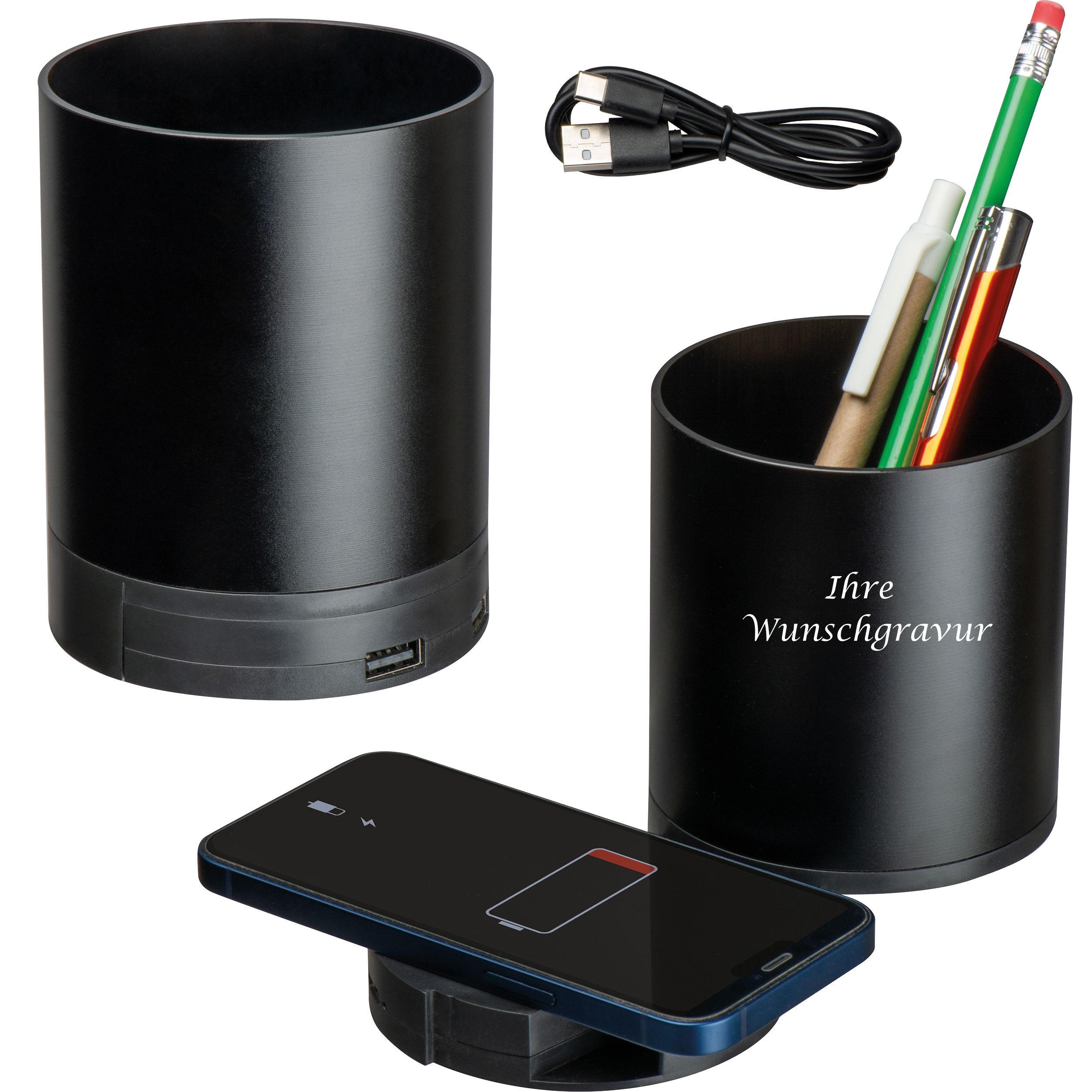 Stifteköcher mit Wireless Charging Funktion und USB-Hub mit Gravur