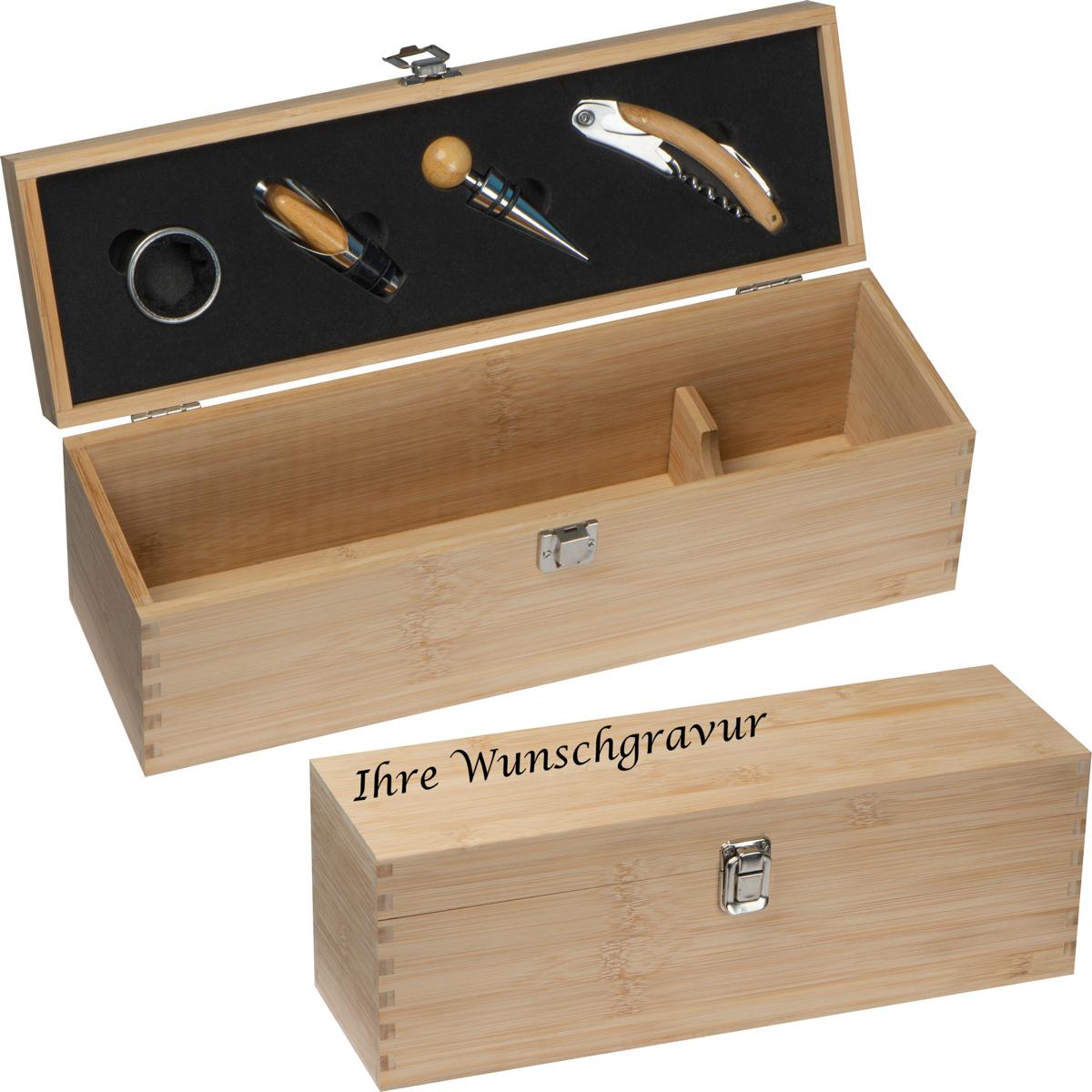 Weinbox aus Holz mit Gravur / mit Kellnermesser, Flaschenverschluss, Ausgießer