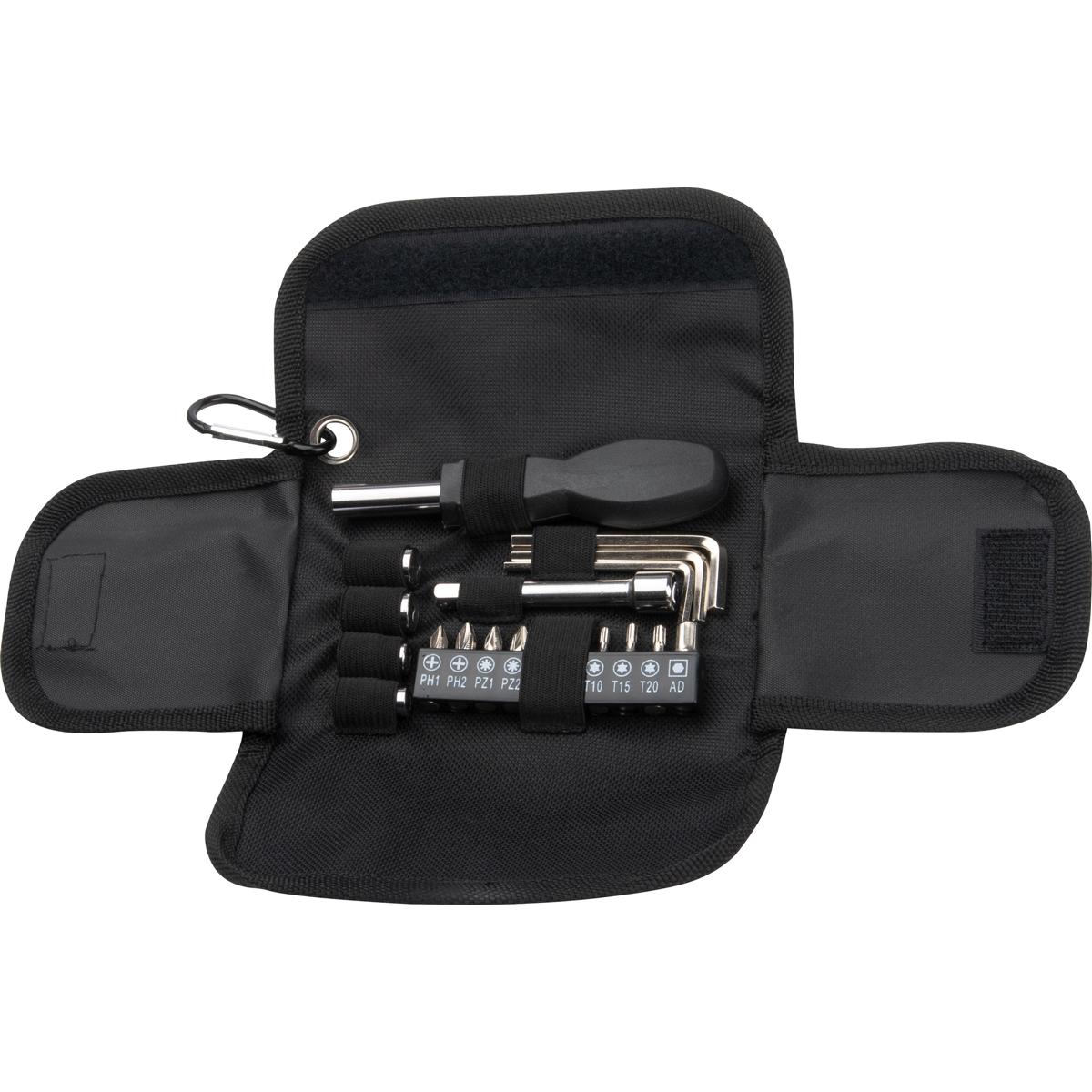 - bestehend aus einem Schraubendreher mit diversen Nüssen und Bits, einem Verlängerungsstück sowie drei Sechskantschlüsseln in verschiedenen Größen,